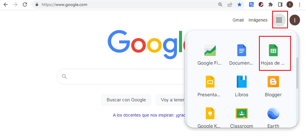 Para cumplir con esta tarea, me ubique en mi pagina de google y me ubique en la parte superior de mi pantalla e hice clic en el botón Apps de Google y seccione Hoja de calculo.