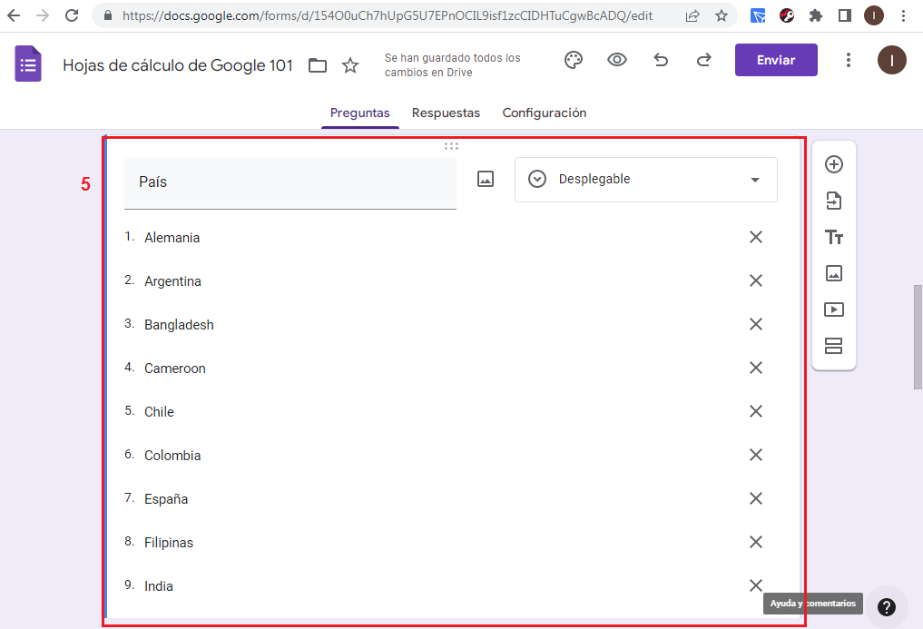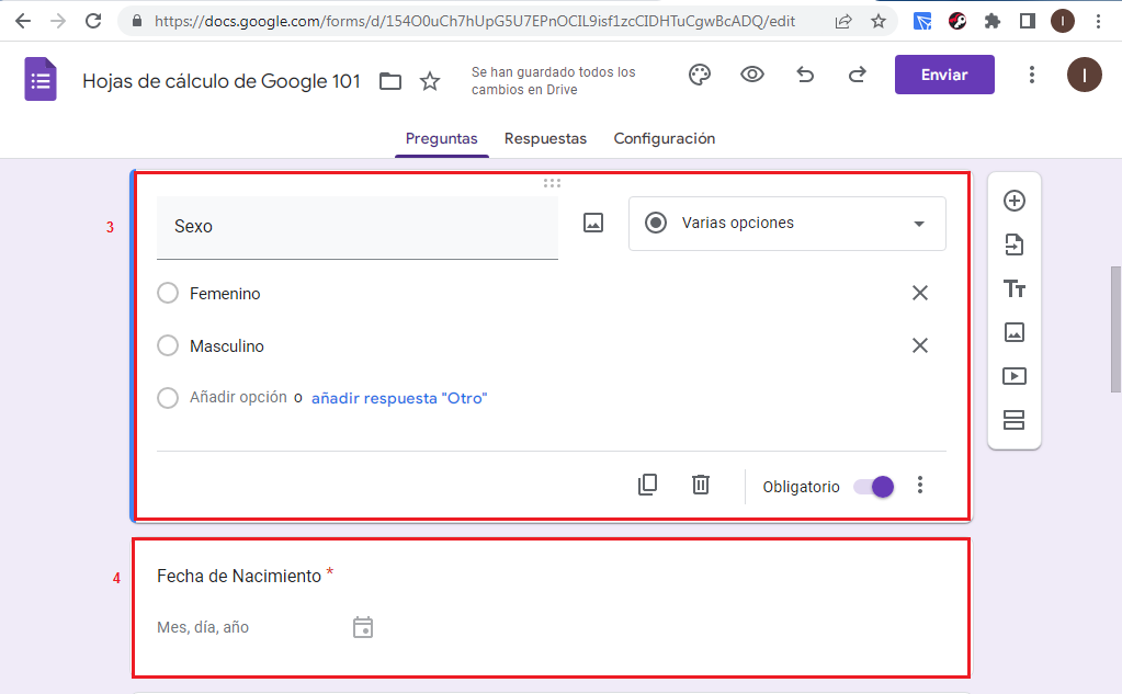 Ademas, active la opción de obligatorio, porque es una pregunta que debe tener respuesta obligatoria, ya que es un dato muy importante.