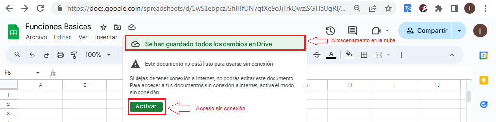 Google Sheets también permite el acceso sin conexión a la hoja de cálculo sin conexión y realizar las modificaciones una vez que tenga dicho permiso, estos cambios se guardaran y se reflejarán cuando se tenga nuevamente conexión a internet y de esta manera serán visibles para los demás usuarios simultáneamente.