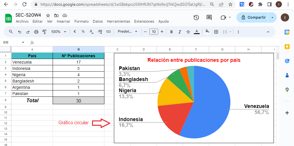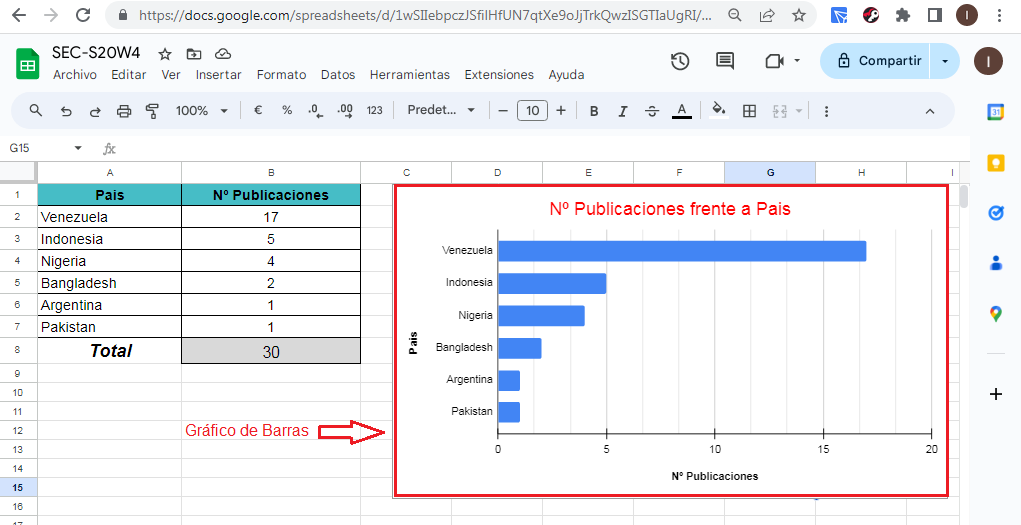 Nuestro gráfico queda de la siguiente manera, y nos permite visualizar el volumen de participación según el país, de esta muestra de 30 publicaciones seleccionadas.