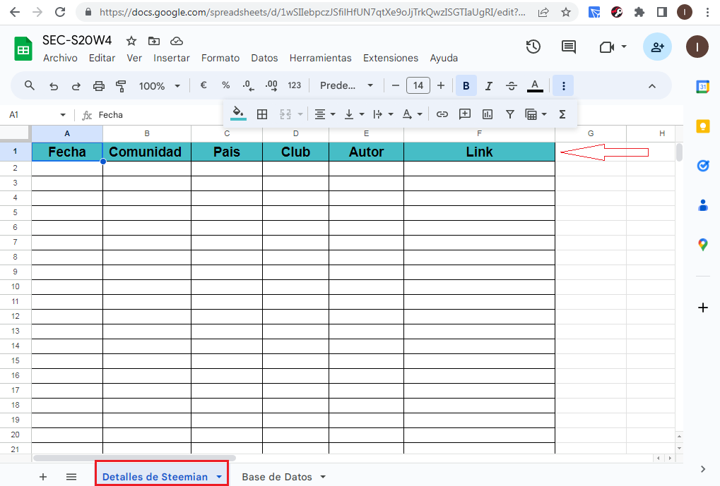 Procedí a crear mi tabla en la hoja 1, que corresponde a Detalles de Steemian.