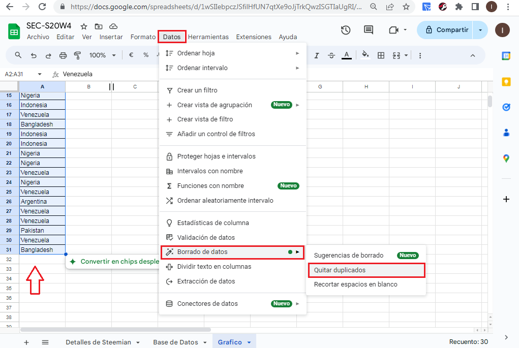 Luego seleccione los 30 datos y utilice la sección Datos, la cual encontramos en la parte superior de nuestra pantalla y seleccione la opción Borrado de Datos y finalmente la opción Quitar Duplicados. Esta opción nos permite filtrar los países de los cuales los Steemian tuvieron participación.