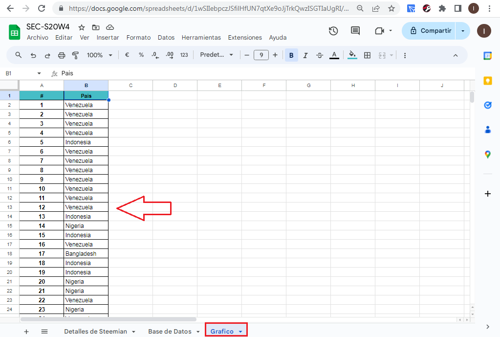 También agregue una nueva columna, para colocar el nº de publicaciones, ya que como vimos en nuestra tabla de Detalles de Steemian diferentes usuario de un mismo país hicieron sus publicaciones. Por lo que es necesario determinar la cantidad de publicaciones que se realizaron según el país.