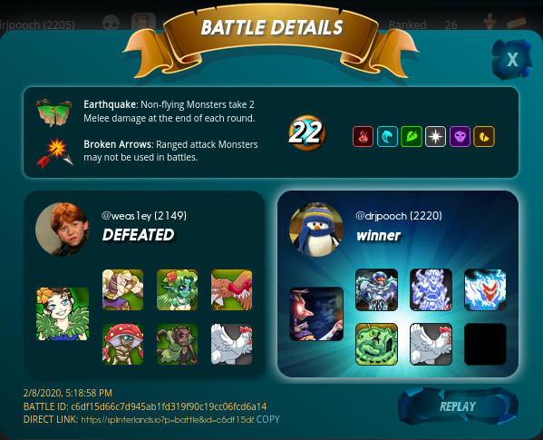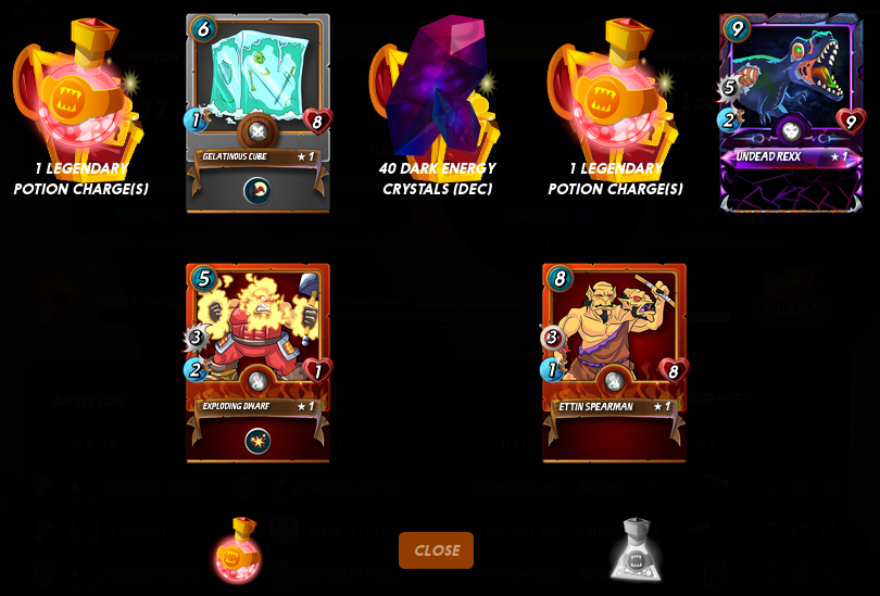 I didn't do any Questing yesterday. :( Was too emotionally beat up from my slog through Saturday battling. And/or was just doing other things (not Splinterlands???). Said Saturday battling was my attempt to complete the Death Quest, and it took me 12 battles -- just barely retaining my Gold League II status. But my final victory was rather satisfying, defeating a Flesh Golem and !monster friends in an Earthquake match.