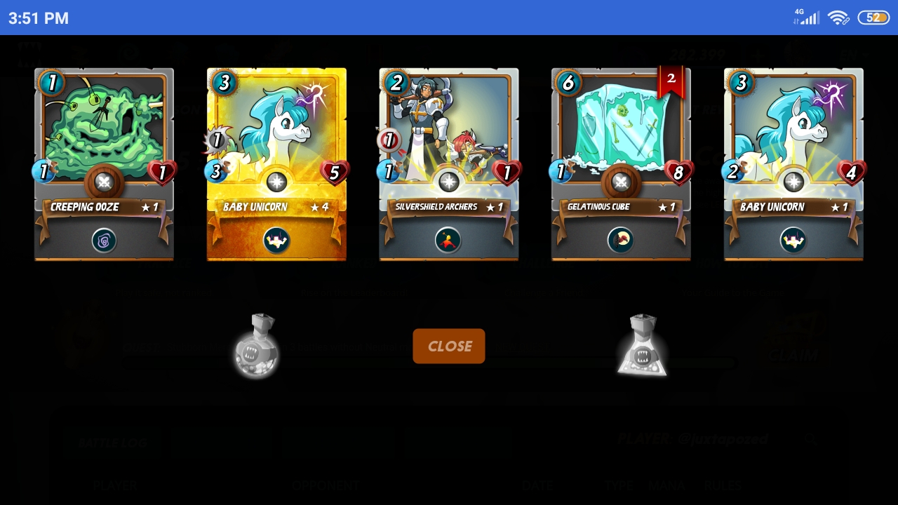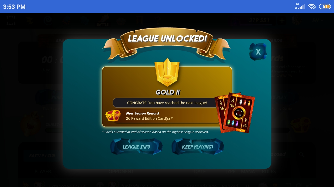Almost 8 months ago, when this account only has lvl 2 commons and rates monsters, on the right hand it could reached diamond 3, better than my main account😂. But with so many lvl 1 bots ...I think it's possible to break the record soon. Still.. I don't play so often with this deck, though. I just let anyone who wants to practice and earn some cards play it.