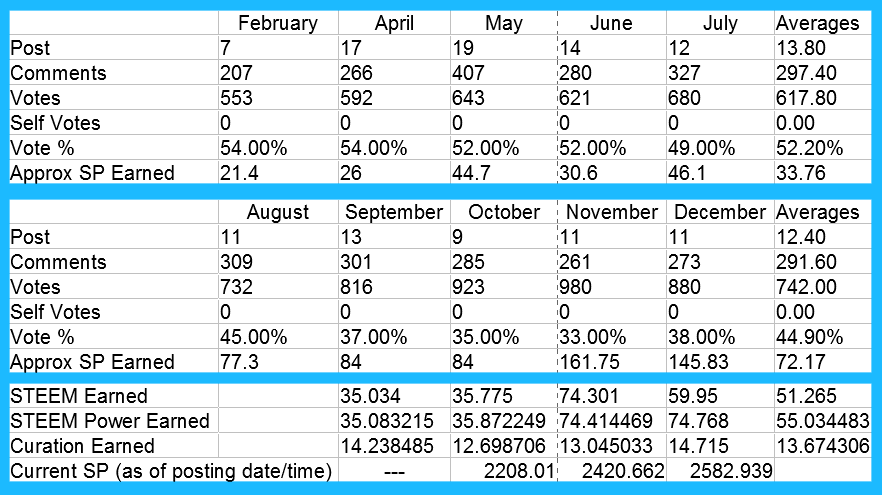 A slight drop off in the number of votes, mostly from trying to not vote down at 33% so often. I would like to keep my vote % around the 45% mark while the vote value of steem is still down a little bit. Hopefully we will see a vote value increase sometime this year. As it is my earned SP is barely keeping pace vote value wise. Still holding pretty steady at no self votes, and I did actually issue one down vote in December.Aprox SP Earned: