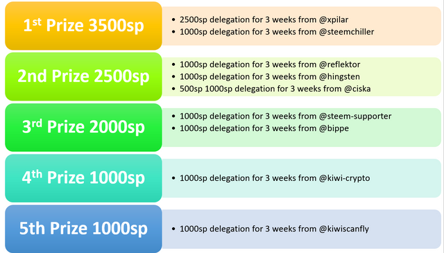 We have 5 x 21 day Steem power delegations on offer plus some great SBD prizes by @stephenkendal