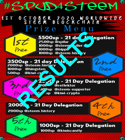 24 hours has passed since the preliminary results were posted for the October edition of #spud4steem, we can now confirm who our five winners are and invite them to confirm acceptance of prizes