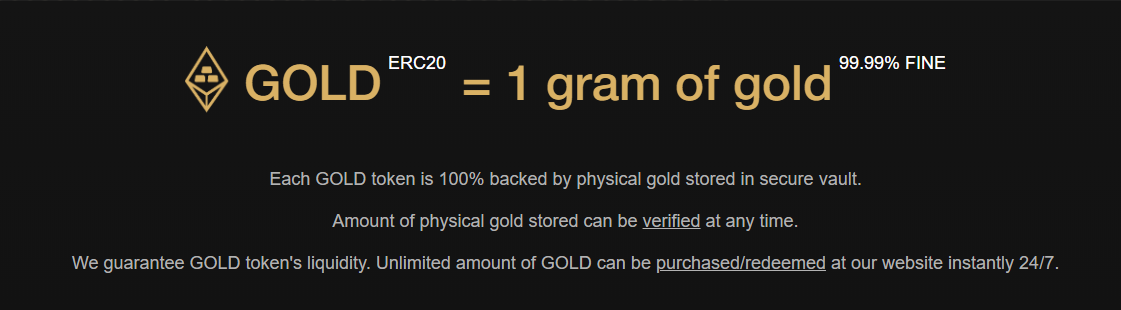 GOLD-token is cryptocurrency classified as Stablecoin backed by pure gold. Each GOLD token has the same price as one gram of 99.99% of pure gold stored in a safe company vault.