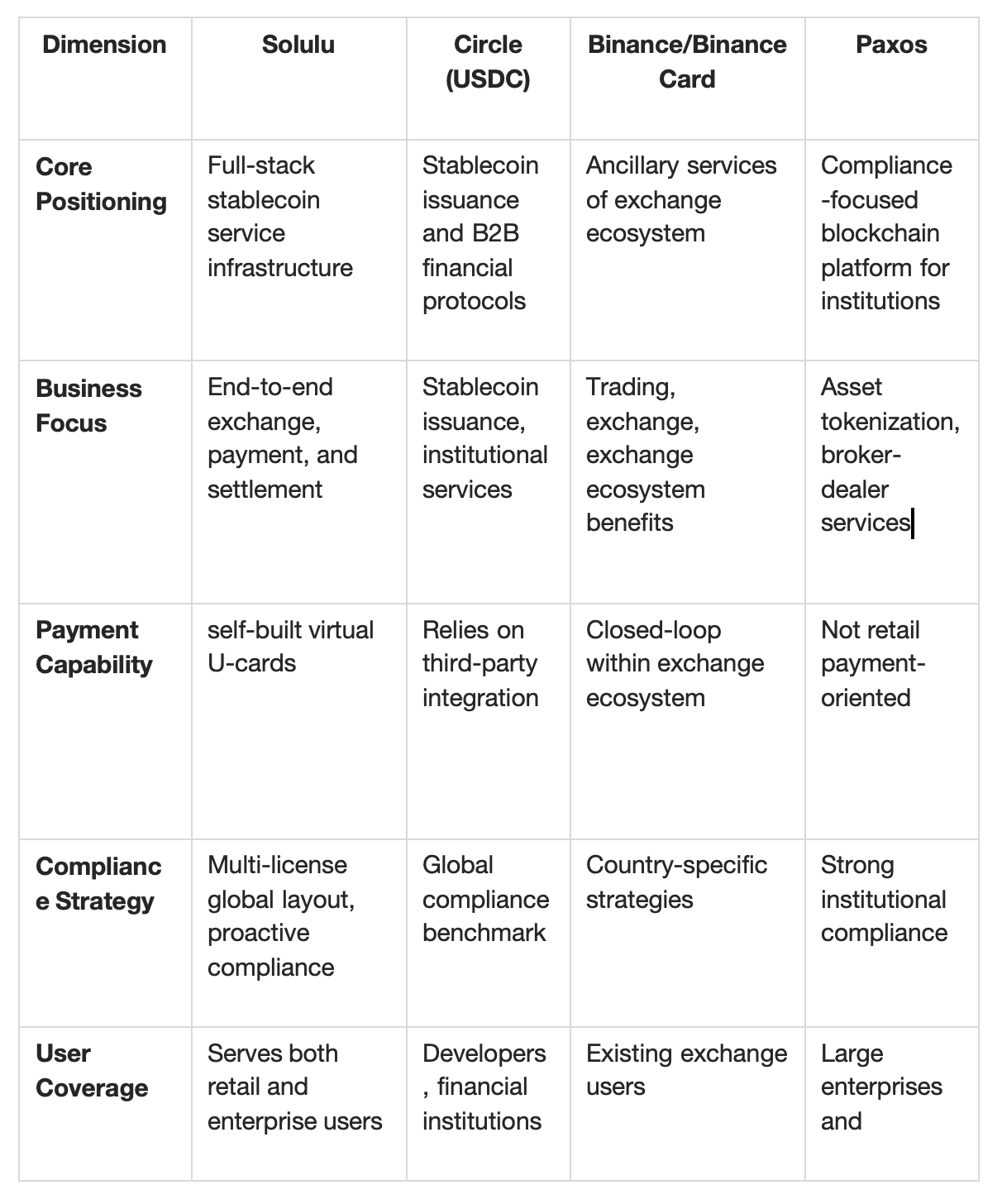 From this horizontal comparison, Solulu’s unique positioning is immediately apparent—it relies on full-stack services, top-tier compliance, and an independent ecosystem to establish itself as a stablecoin infrastructure provider. It goes beyond simply offering exchange or payment functions. Solulu aims to build a comprehensive ecosystem: integrating Visa cards, social transfers, and global settlement into one seamless experience. The goal is to ensure stablecoins can flow smoothly and compliantly across every link, from everyday consumption to cross-border trade.
