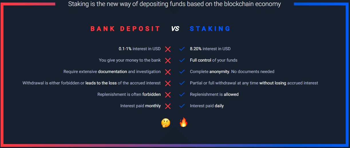 Why is staking much better than a bank deposit? There are a lot of reasons, but the most attractive of them are the lack of verification and the most gorgeous percentage of profit.