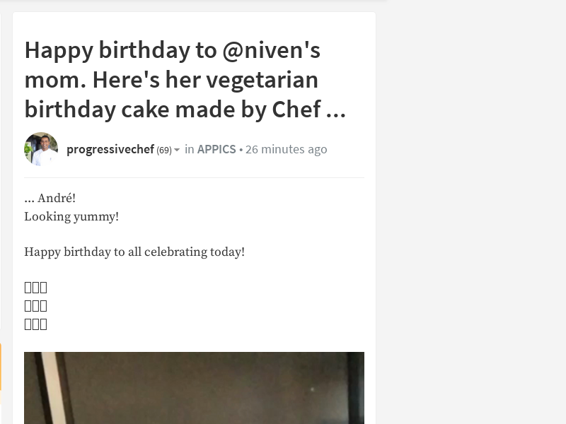 Here's her vegetarian birthday cake made by Chef ...](https://steemit.com/@progressivechef/appics-v1-appics-im-312197)
