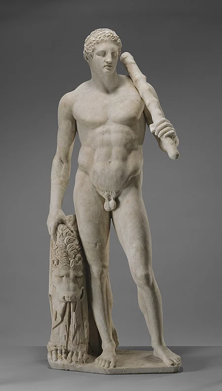 The Lansdowne Heracles is a roman marble sculpture dating from about 125 CE. it represents the hero Heracles as a beardless youth grasping the skin of the Nemean lion with his club upon his shoulder. the statue was discovered in 1790 on the site of Hadrian's Villa in Tivoli, and now in the collection of the j. Paul Getty Museum's getty villa in Malibu, California.