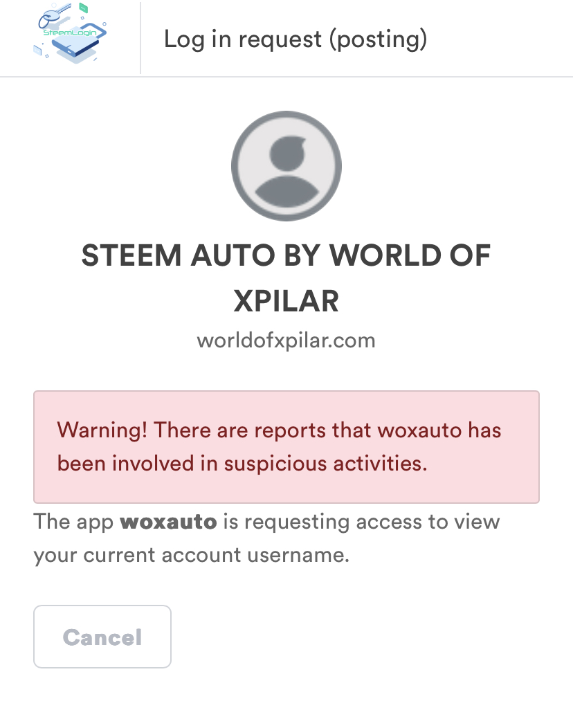 However, when I try to login to SteemAuto, they give me a warning with the words Warning! There are reports that woxauto has been involved in suspicious activities.. Then there is no feature to give access to "woxauto", only the Cancel option is available. Something suspected might be happening on the SteemAuto web, so we have to be careful.