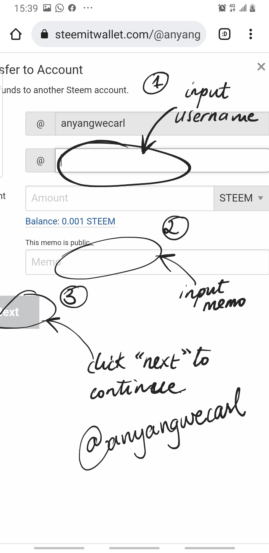 - Input the username of whom to wish to transfer Steem to, fill in the memo and click on Next to proceed.