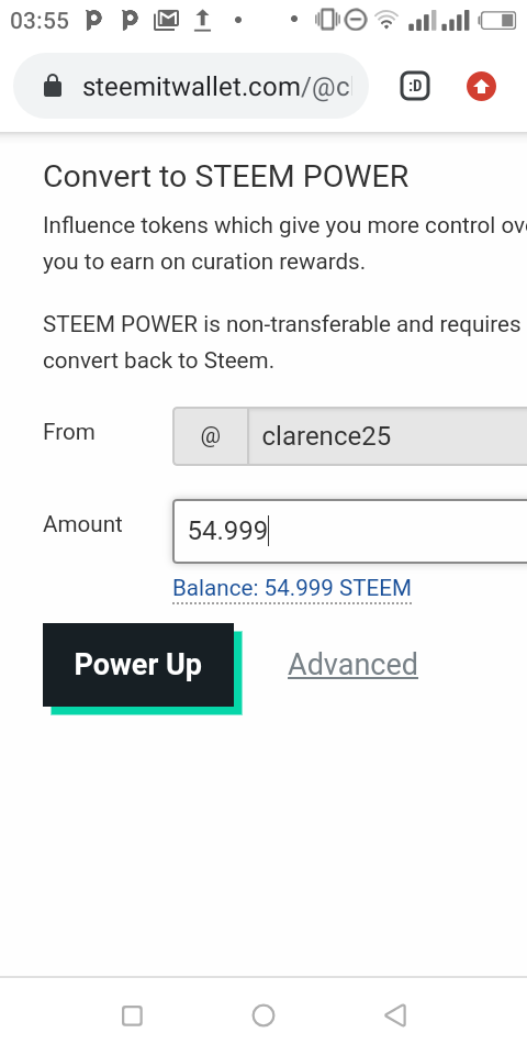 - After this my steem was increased to 54.999 in which I powered up by hitting the drop-down button and clicked on power up which opened this page asking the amount I wish to power up and after which was successful.