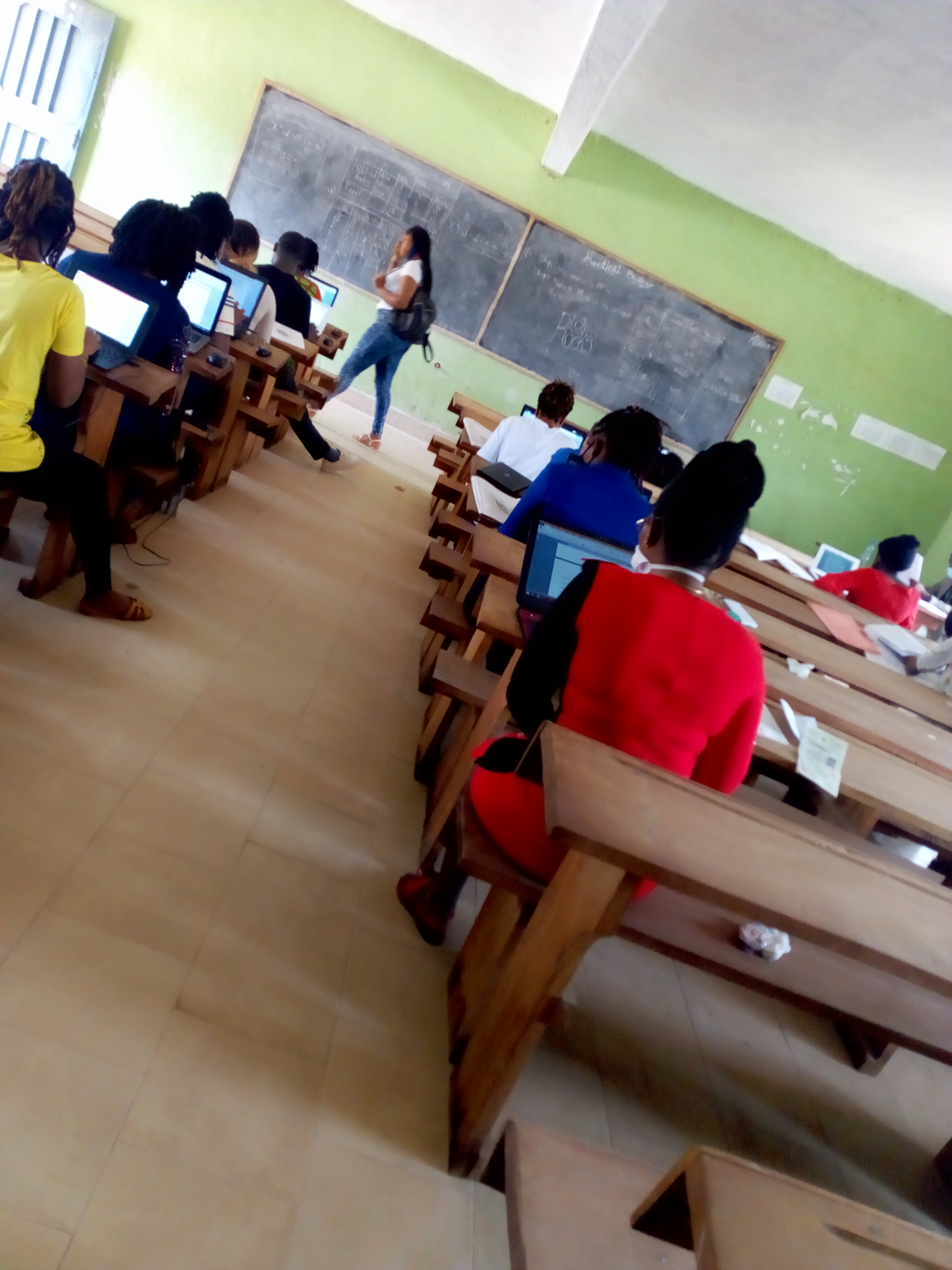 I went to the campus at around 8:00am to see if all the HND students from National Polytechnic University Institute under the Department of Executive Secretarial studies were already in the hall but I picked my shock that non for them were around so I started call them to come fast to school because the invigilators were already in the hall and the other students from other schools were already there so they were the only ones remaining. All of the students arrived at 8:45am and most of them did not have laptops to use for the practical so the invigilators beg to help and look for machines for them to use to I started moving from one place to the other to get laptops for the students. I succeeded in getting 4 laptops from my citie so I went with them to the hall and I gave the students. As I was about going out the the invigilators asked me to come and help them and invigilate I stood back behind the class as you can see the picture below showing the students doing their practicals.The picture is showing but their backs because I was standing but behind the class when I took the picture.