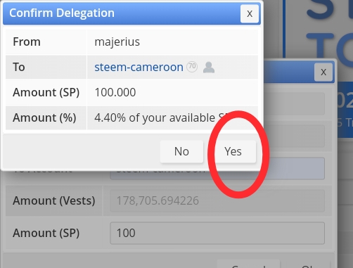 Screenshot from SteemworldOnce you've inputted all the necessary information, you can then go to OK and another pop up will appear on the screen asking you to confirm the delegation. As shown below once you click on the confirmation button, then that's all.