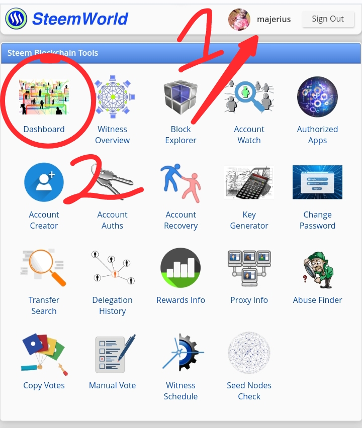 Screenshot from SteemworldThe confirmation to know of you're successfully signed in is that you'll see your username and your profile picture appear on the top right corner of the screen as you can see below. After that you can click on the dashboard button as you can see on the picture below.