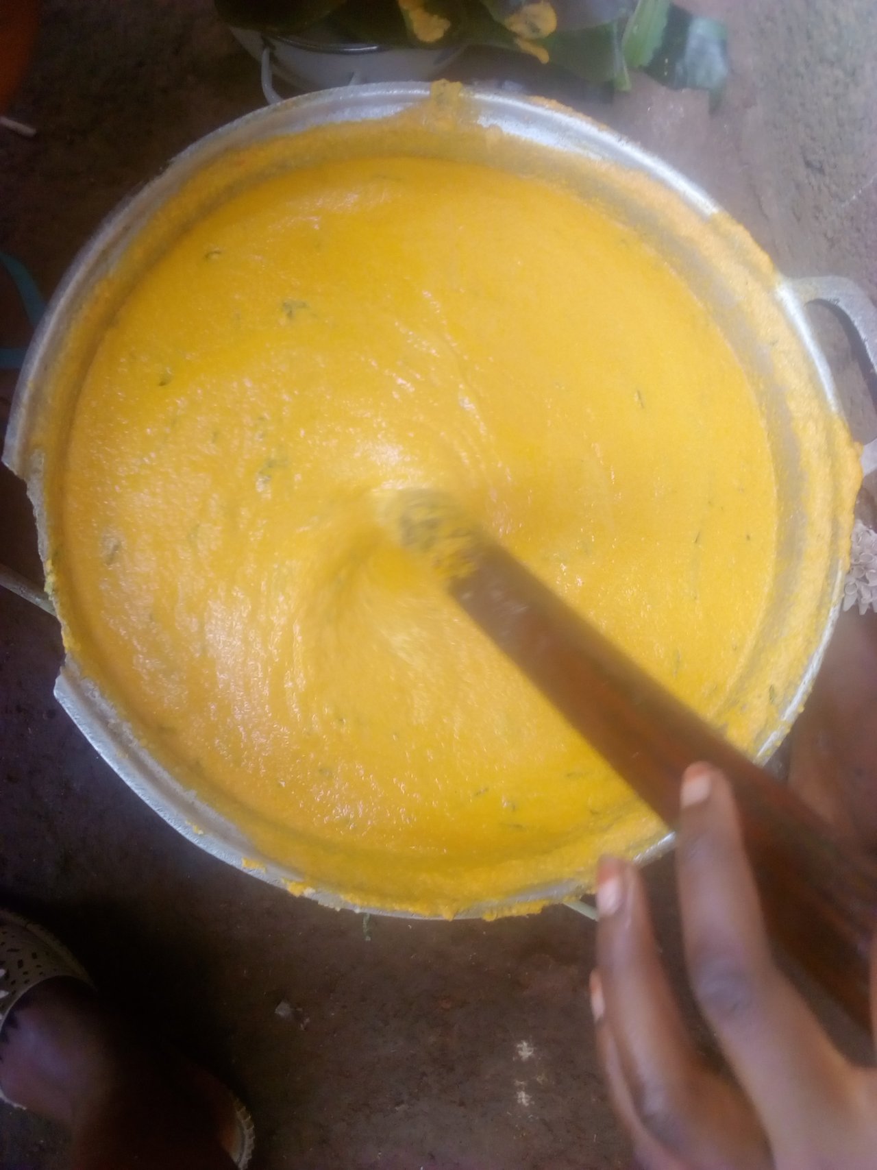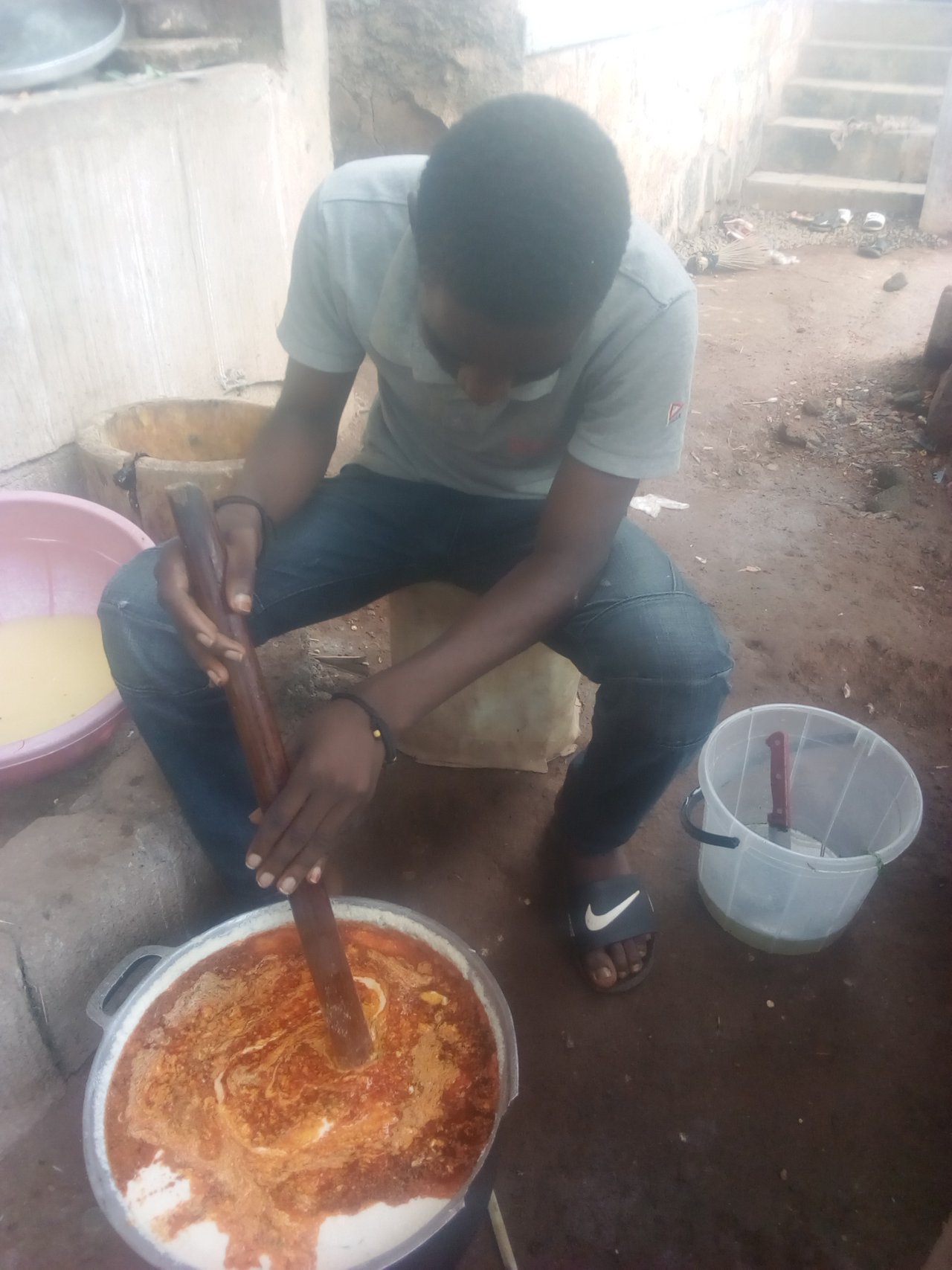 So the first thing I did was I sooked the koki inside water because it needs to be in the water for at least two hours, and after I sooked it I discovered that I didn't brush my teeth so I rushed and got my tooth brush and brushed my teeth and after I finished brushing my teeth it was about 5:00am, so I took my phone and watched some videos online for about thirty minutes, so I went back to the koki and drained the water from it to prepare it for grinding so after I was done I did all the necessary things that had to be done so I finished and went for grinding at about 6:30am but the grinding doesn't take that much time it could take about ten minutes depending on the quantity, so I grinded it and came back and put it in the pot and I put some red oil there and started mixing it