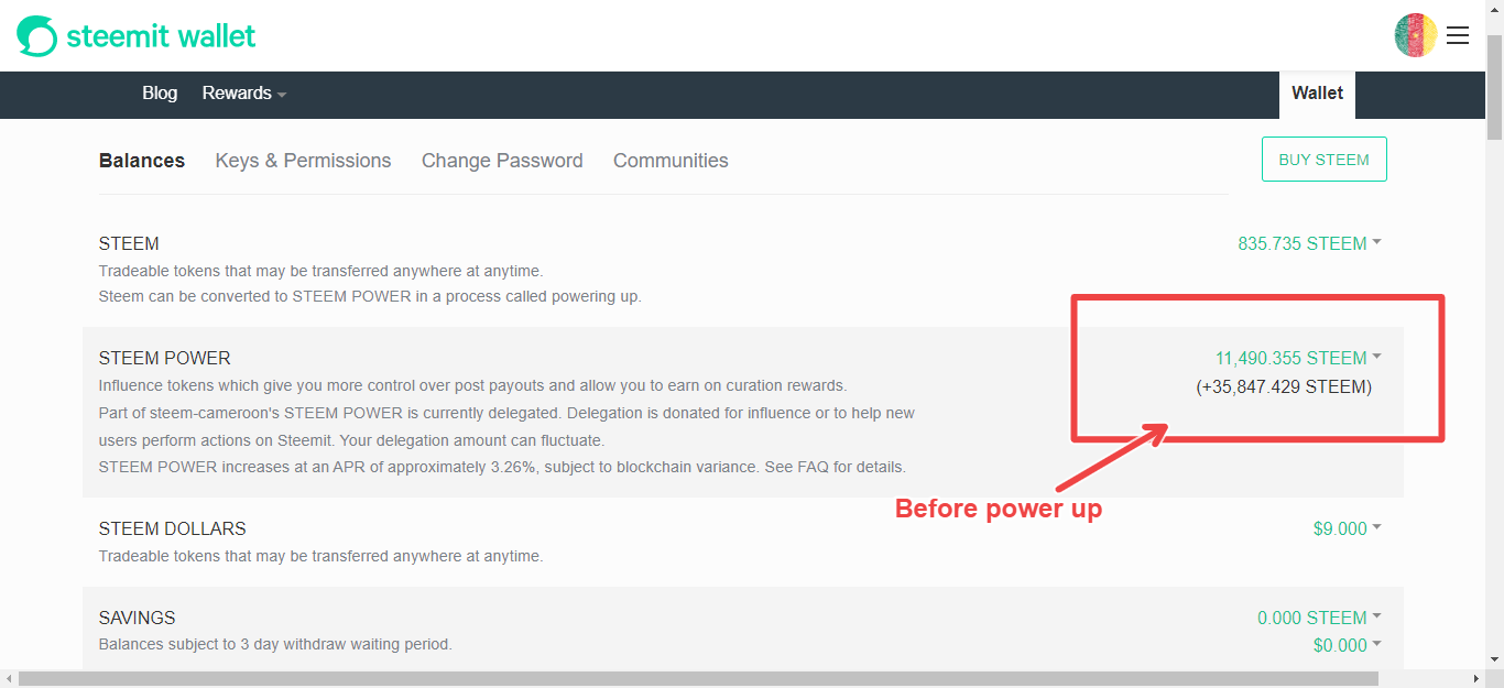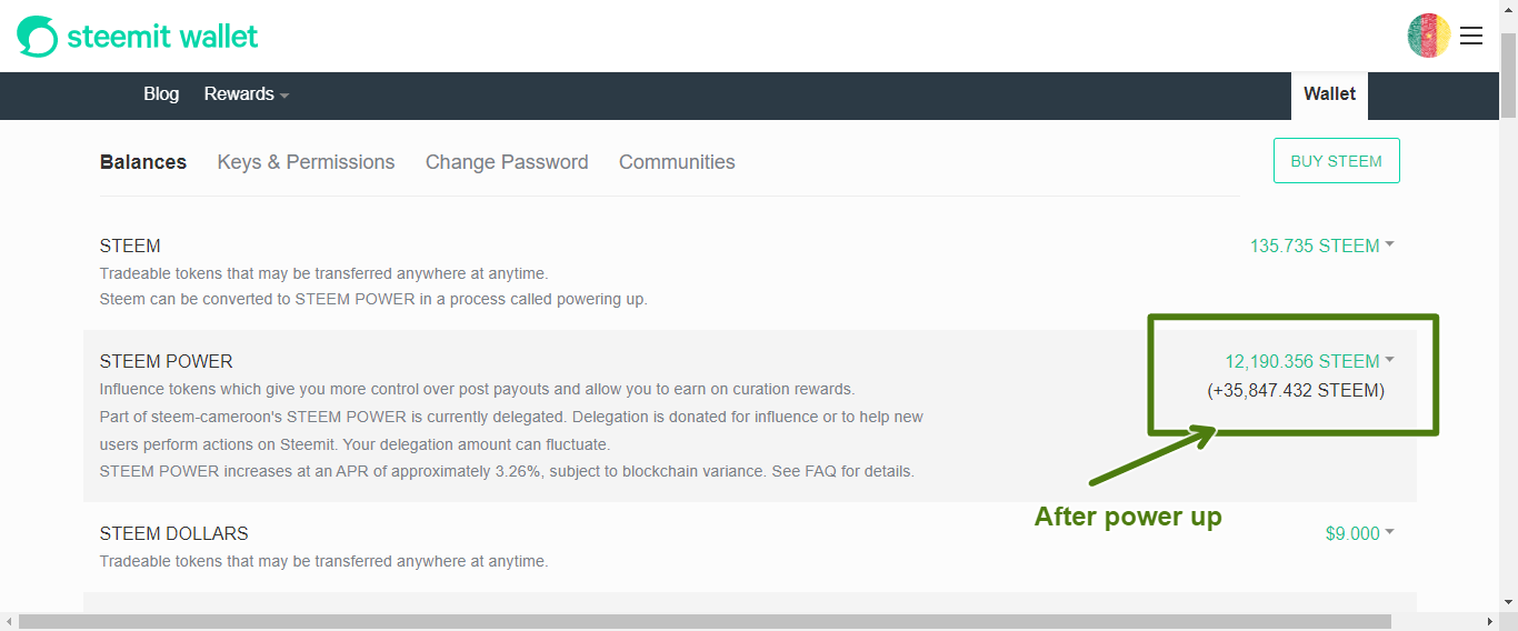 Today, Steem Cameroon powered up her account by 700 Steem moving her SP to 12,190.356 STEEM as you can see in the images below: