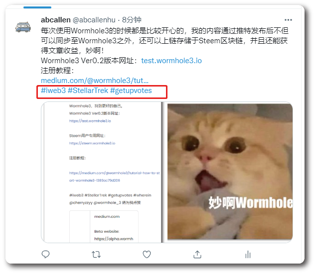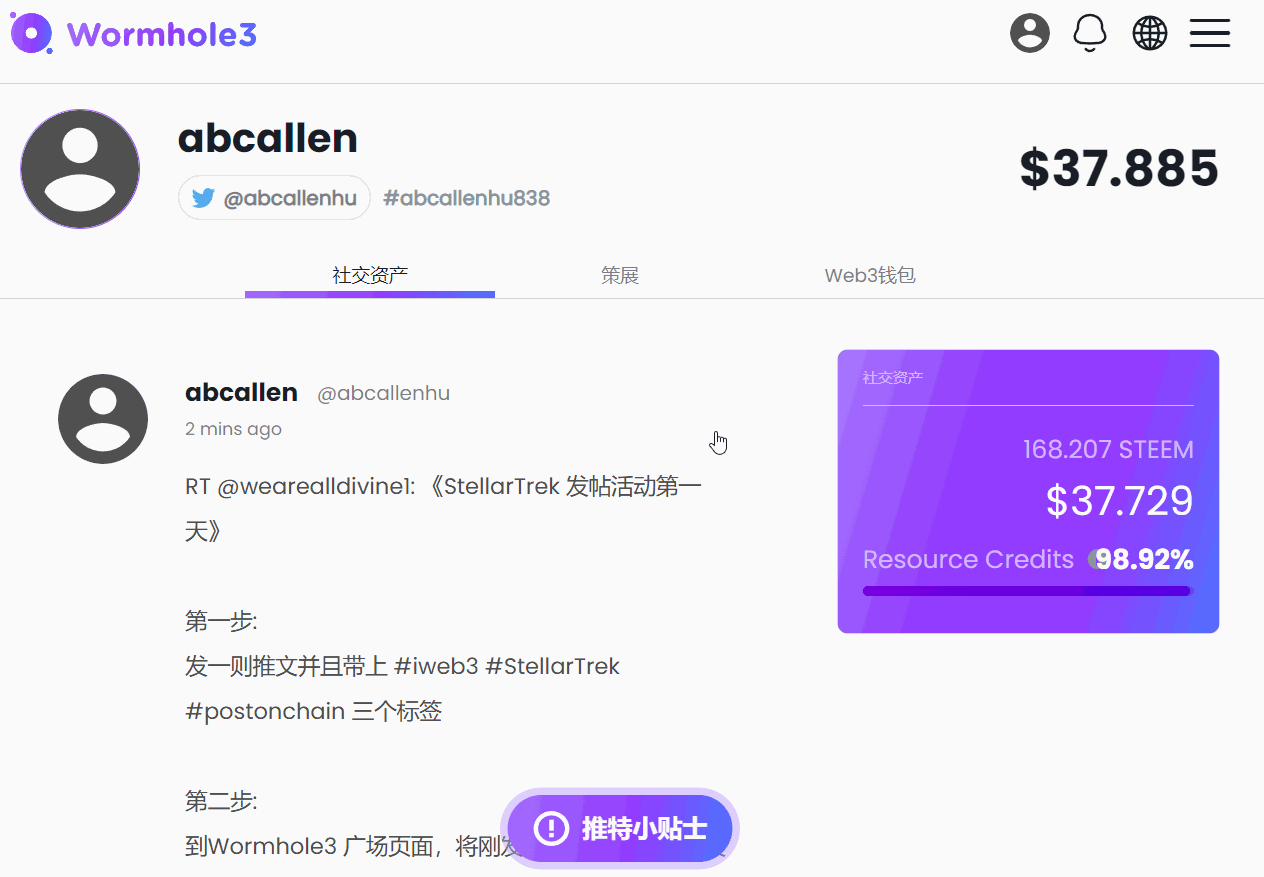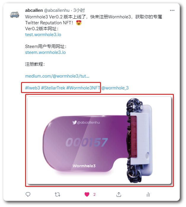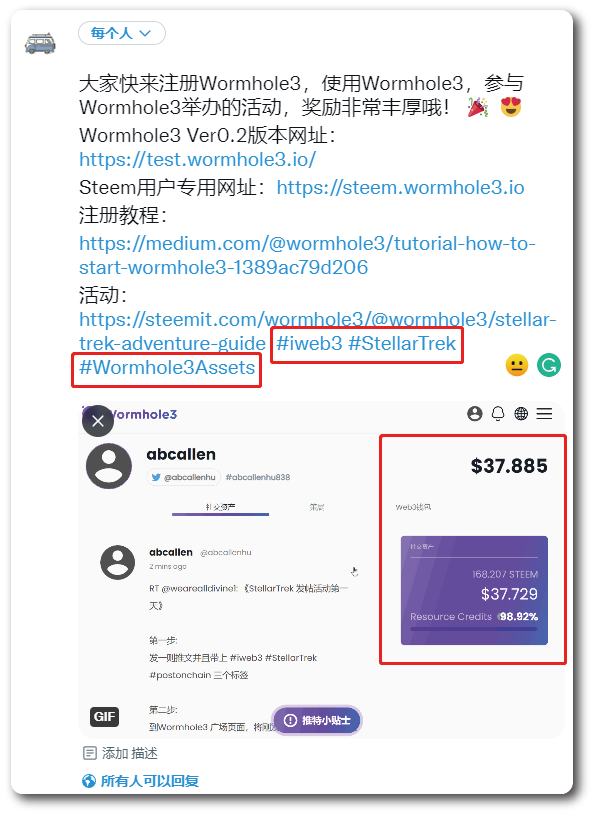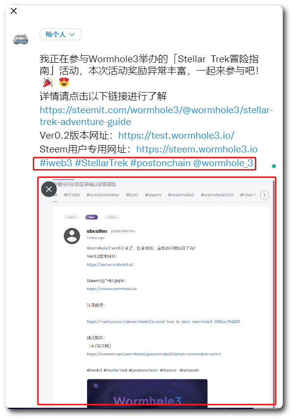 • 发推后在Wormhole3广场页面找到同步并上链的推文,然后截图该推文,之后再通过推特发推,发推的时候也请加标签 #iweb3 #StellarTrek #postonchain,也请@ Wormhole3官方推特@wormhole_3 。