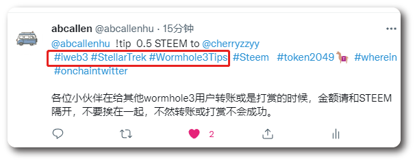 通过推特发推的形式打赏Token给同样注册了Wormhole3的小伙伴,并且推文需要加标签 #iweb3 #StellarTrek #Wormhole3Tips