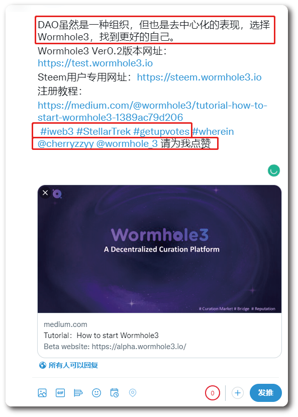 通过推特发布一条你觉得精彩的推文,让你的好友来为你点赞(你的好友如果是Wormhole3用户最好),并且@ Wormhole3官方推特@wormhole_3 求点赞,Wormhole3官方将会依次点赞。