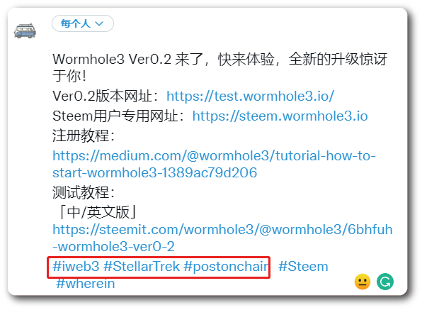 • 发推打赏的时候仅需要更换被打赏人的推特账号即刻,请保留@wormhole_3,各位小伙伴在给其他wormhole3用户转账或是打赏的时候,金额请和STEEM隔开,不要挨在一起,不然转账或打赏不会成功。