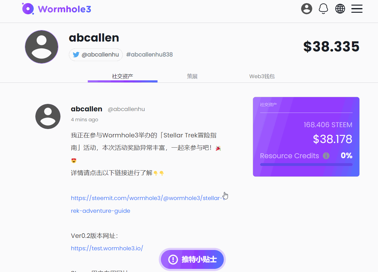 特别注意!!!在Wormhole3,无论是打赏行为还是转账行为其实都是转账交易,如果你本身就是一位Steem用户,那么很抱歉,你无法通过Wormhole3以发推的形式进行转账交易,因为Steem用户在注册Wormhole3的时候只绑定了Posting key,并未绑定交易所需要的Active Key,所以Steem用户在注册Wormhole3后无法通过发推的形式进行转账交易,所以也无法参与任务二,请跳过任务二!