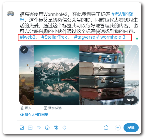 任务五需要各位小伙伴在推特发推时创建一个独特的标签,并且对这个标签进行解释,并且@ Wormhole3官方推特@Wormhole_3,然后带有标签 #iweb3 #StellarTrek #tagverse