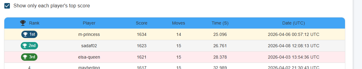 | Rank | User | Score | Moves | Time (s) | Prize | Entry Link |