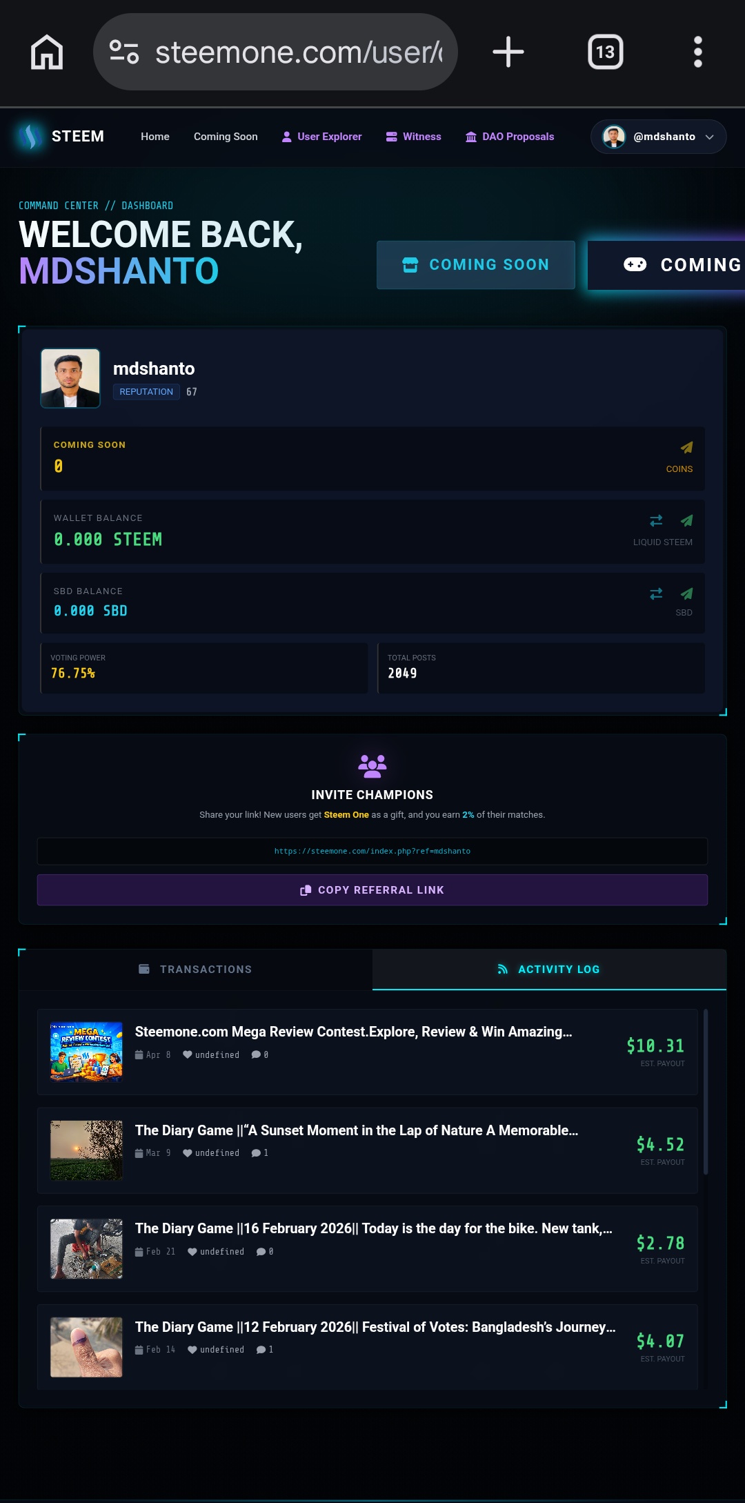Next to the Transaction History, you will find the Activity Log section. By clicking on it, you can see all your daily blog posts that you have published.If you click on any of these posts, you will be directly redirected to that post on the Steemit platform, where you can view the full content of the post.