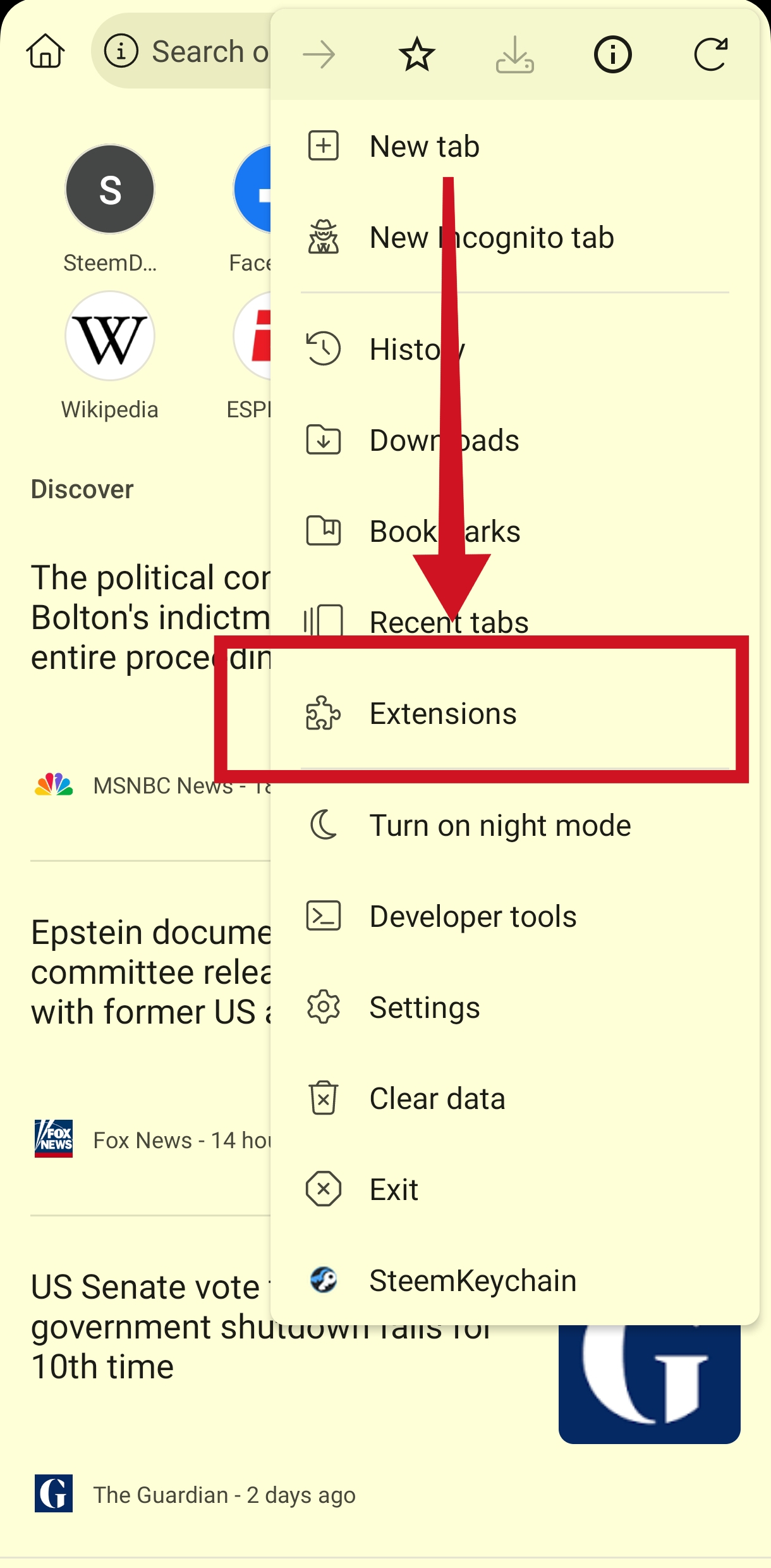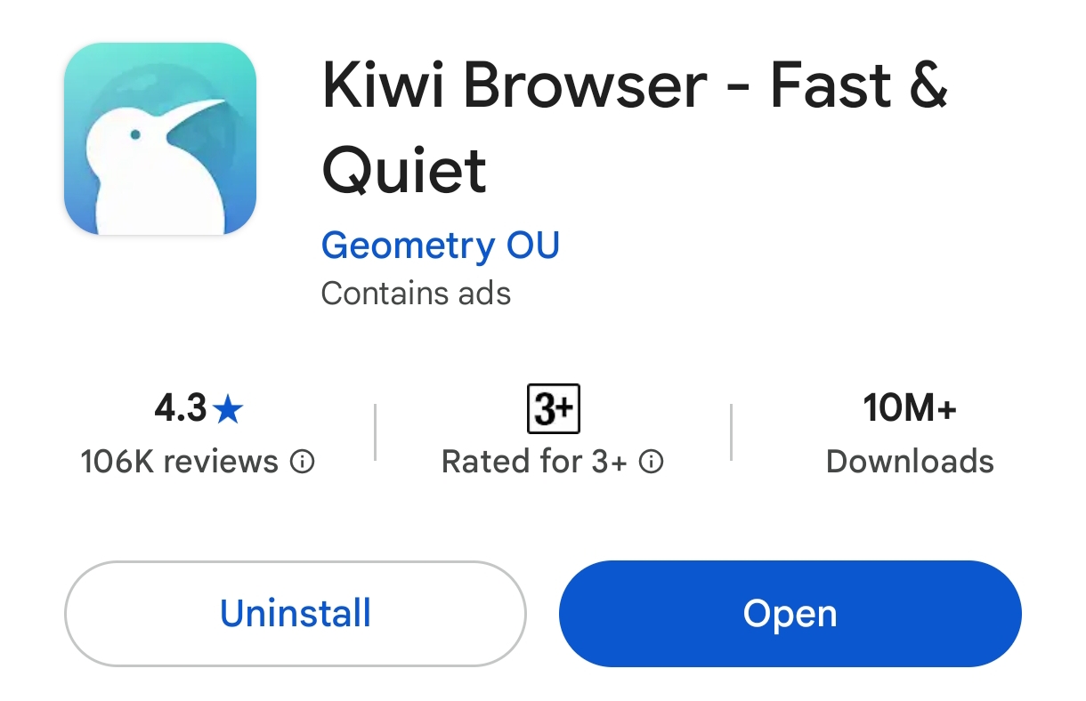 First, go to this link and install the Kiwi Browser from Google Play Store: https://play.google.com/store/apps/details?id=com.kiwibrowser.browser