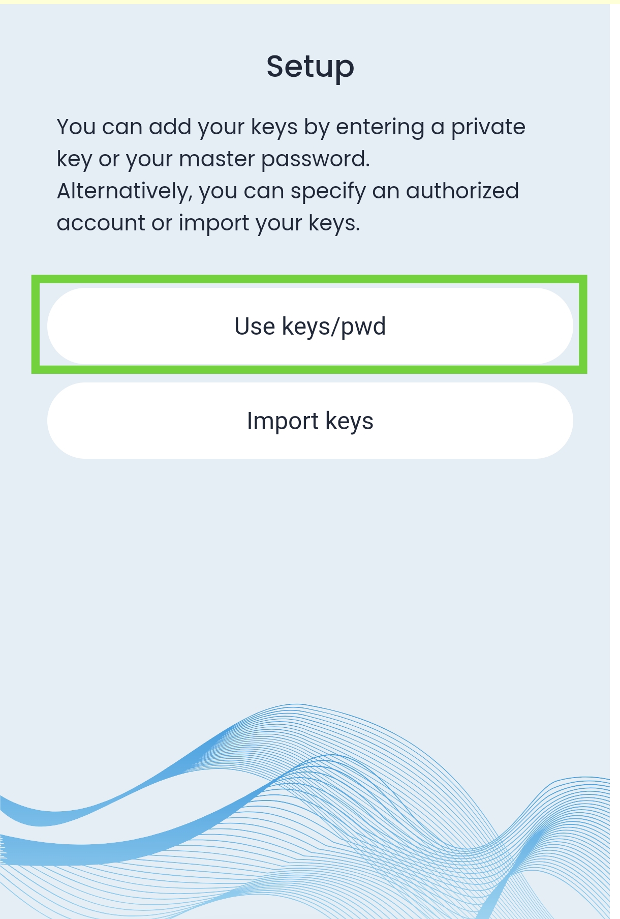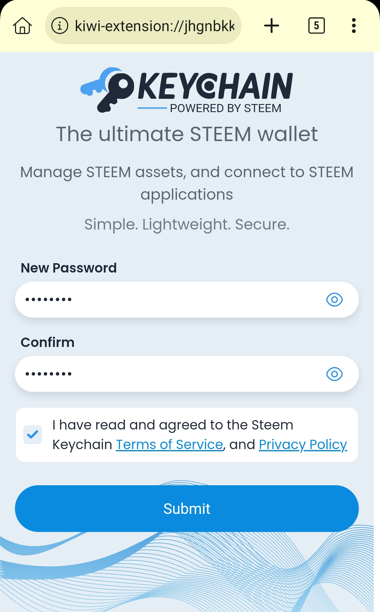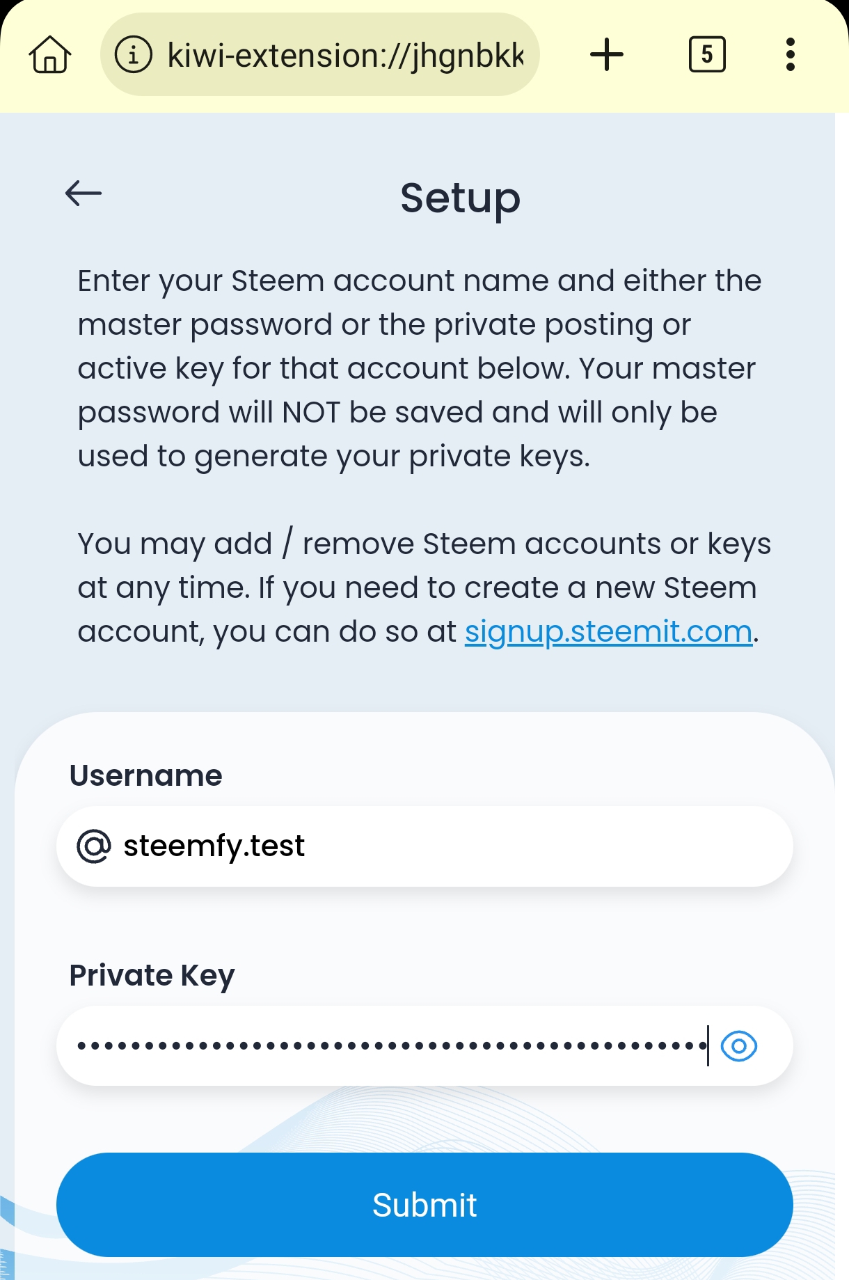 Open it and set a new password. Then a new interface will appear. Here, submit the private key of the Steemit account you want to set in the extension. If you want to add more keys, go to Accounts → Manage Accounts → Add Account inside the Keychain. After submitting the key, your setup is complete.