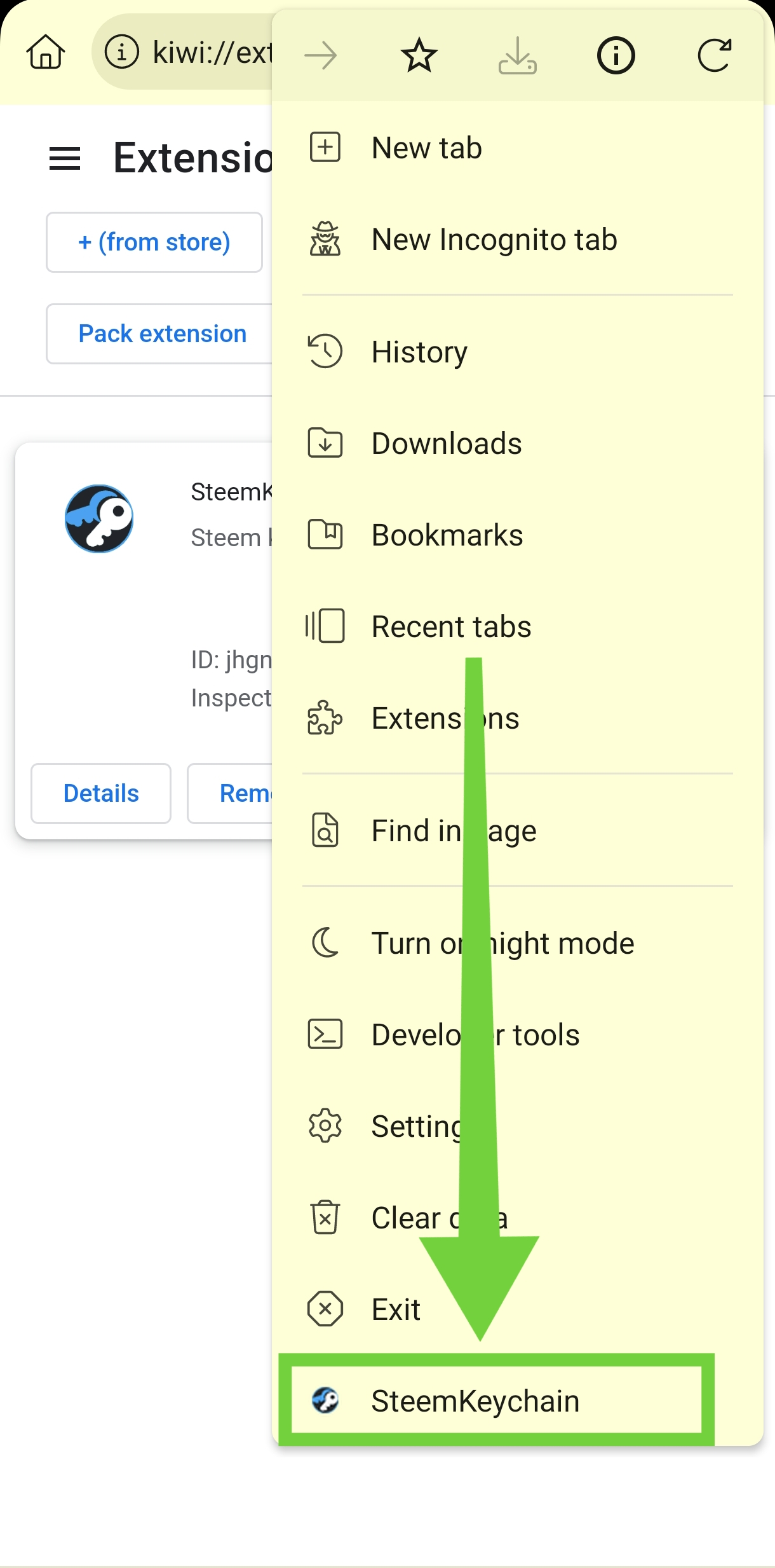 Now to set up your Steemit ID in the extension, again click the three dots on the right. At the very bottom of the popup window, you will see the newly added Steem Keychain.