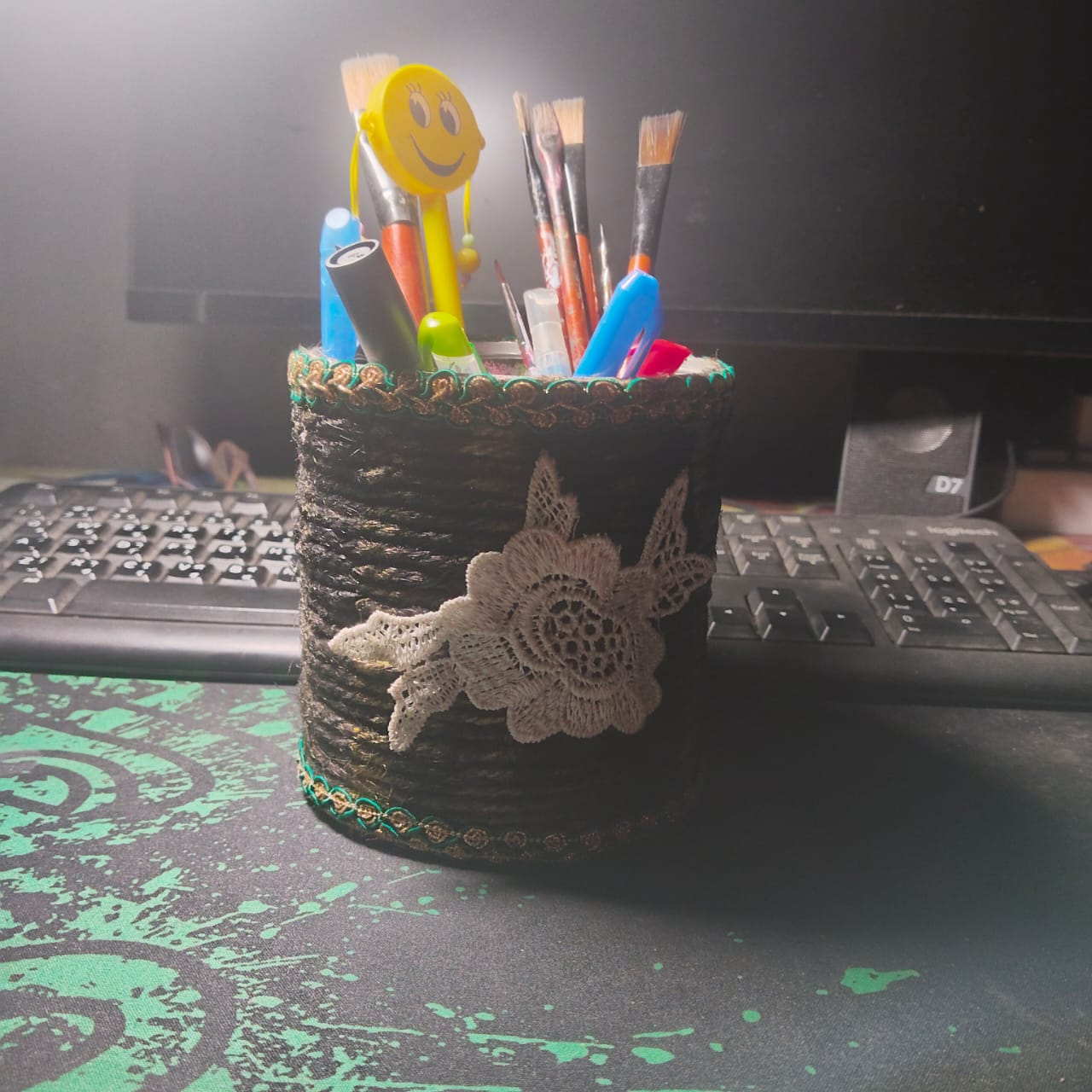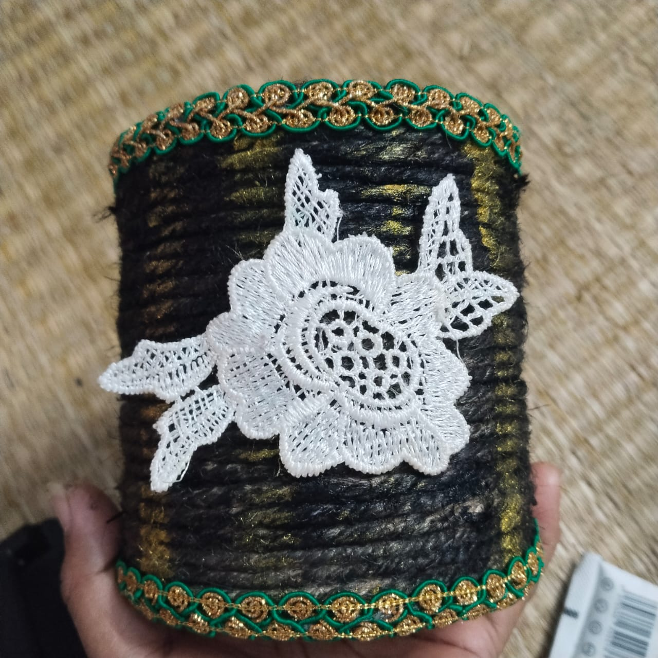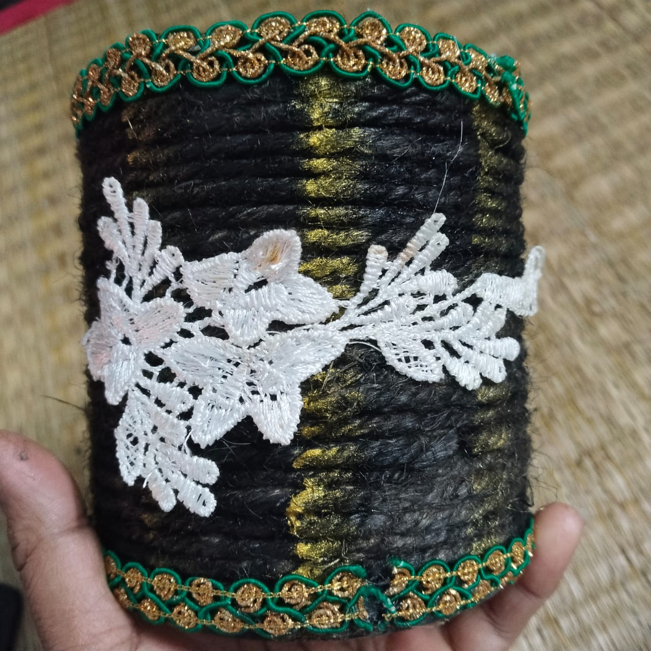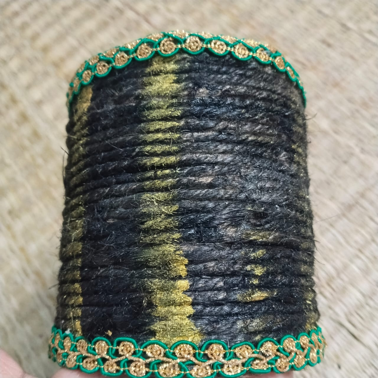 Step-3: When the glue on the rope attached to the container dries, I give it black color. Once the entire thing is given black color, I give it a shade of golden color.