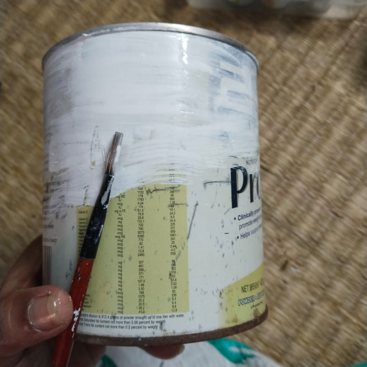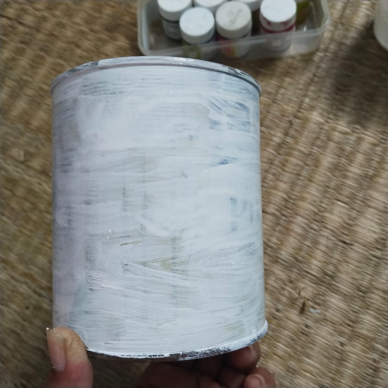 Step-1: First, color the entire tin container with white fabric color. Once the entire container is colored, let it dry.