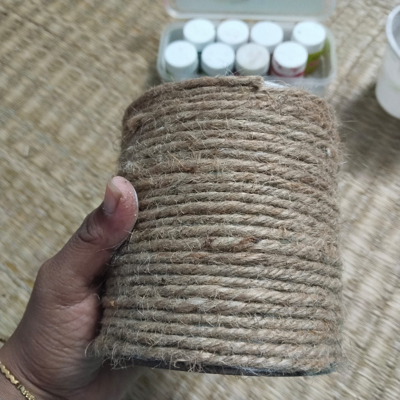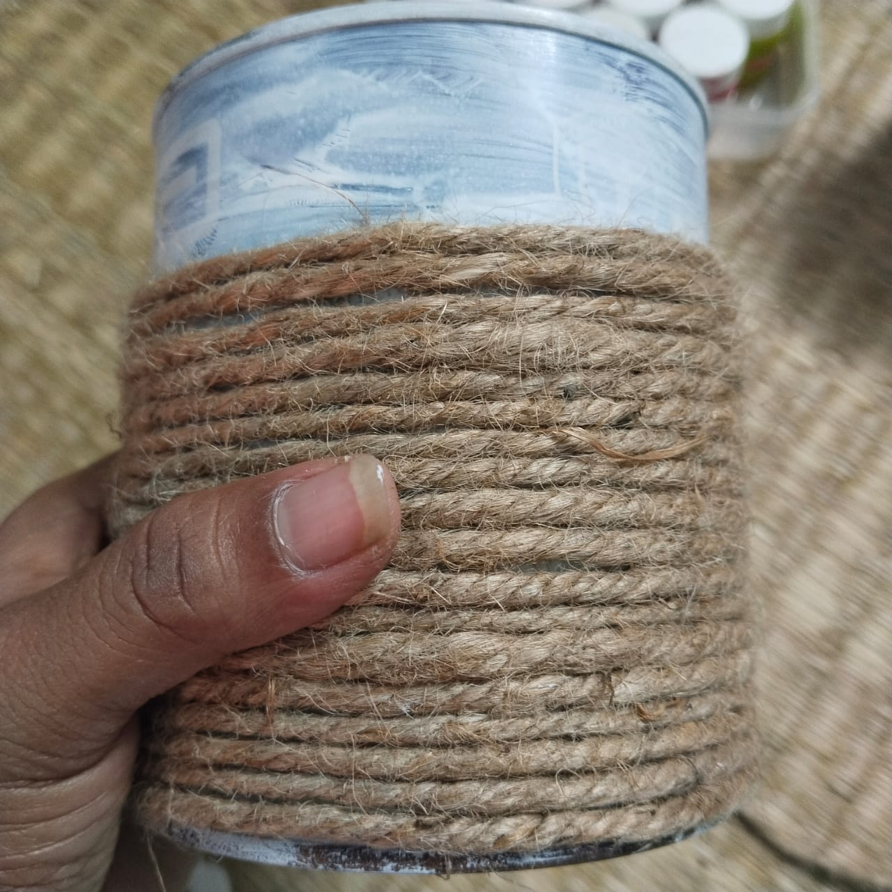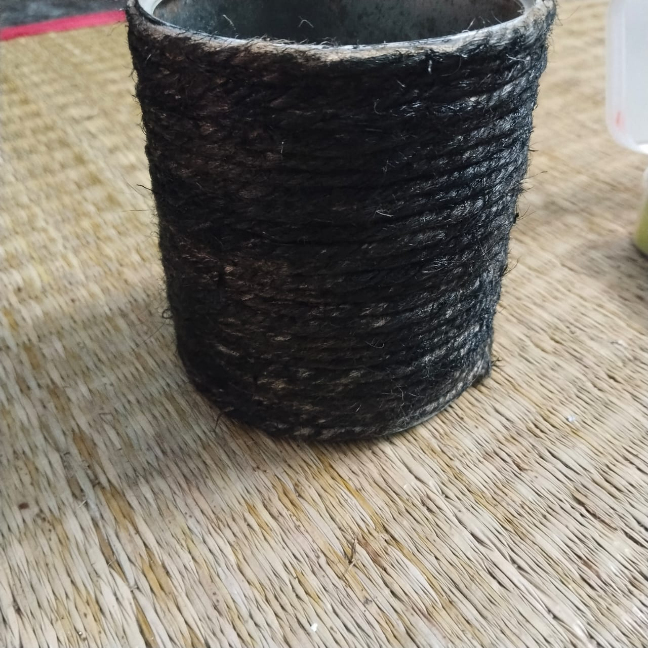 Step-2: Once the color in the container is dry, apply B6000 glue and attach jute rope around the container. Once the rope is attached to the entire container, leave it for some time to dry.