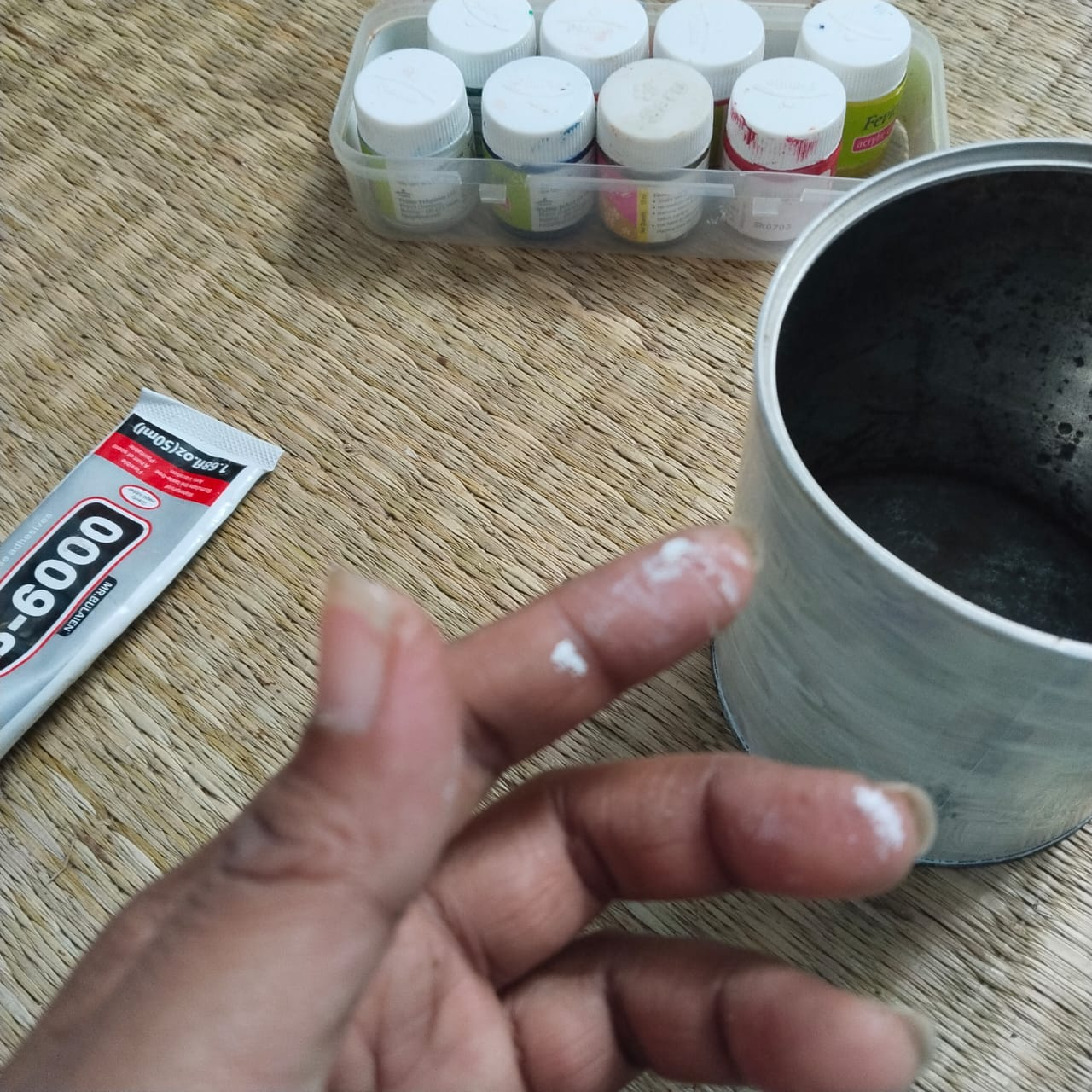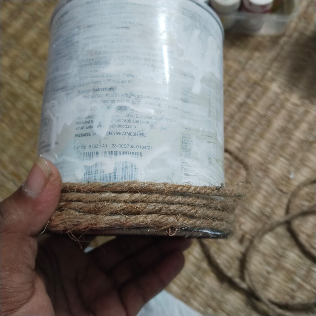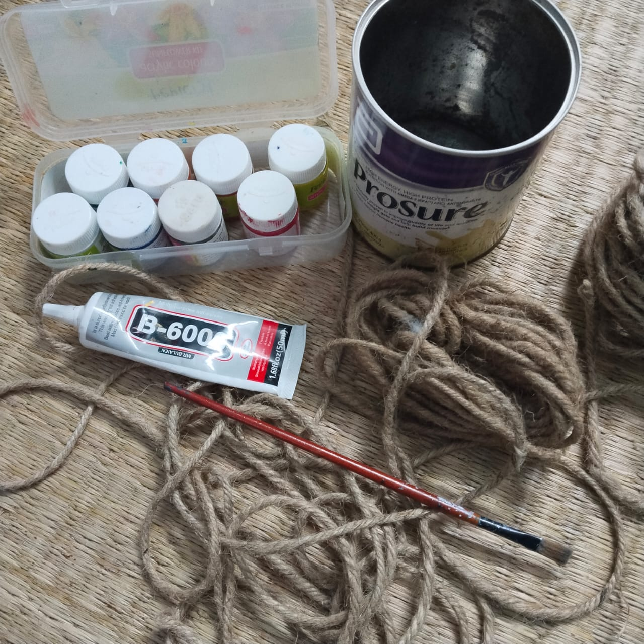 Step-2: Once the color in the container is dry, apply B6000 glue and attach jute rope around the container. Once the rope is attached to the entire container, leave it for some time to dry.