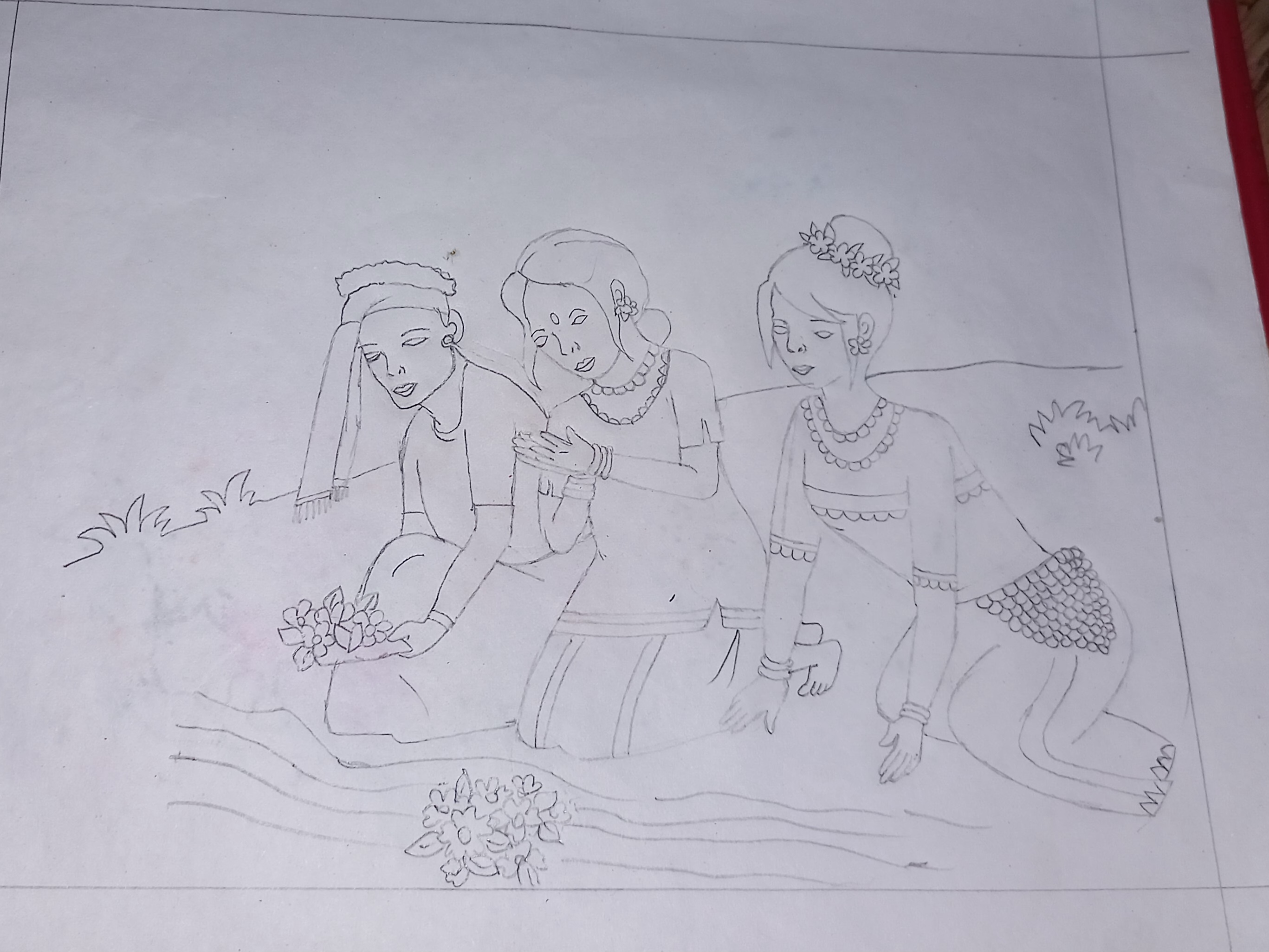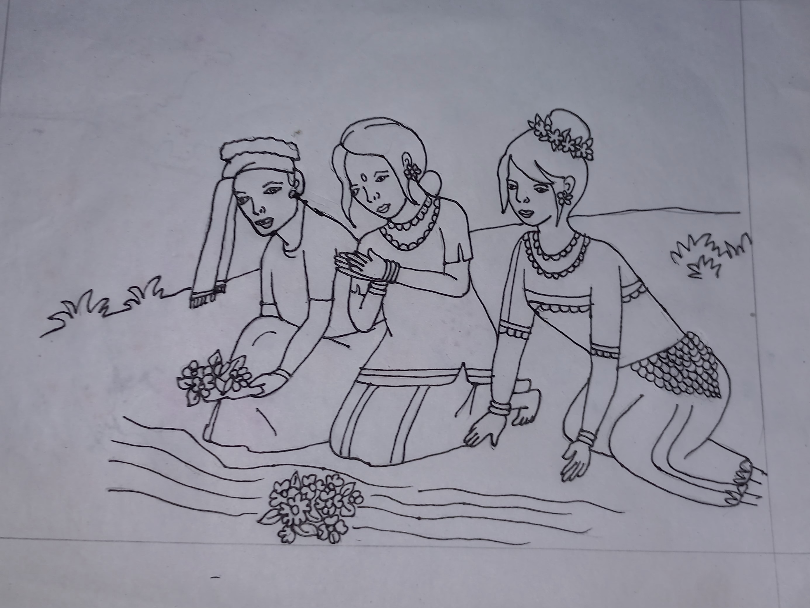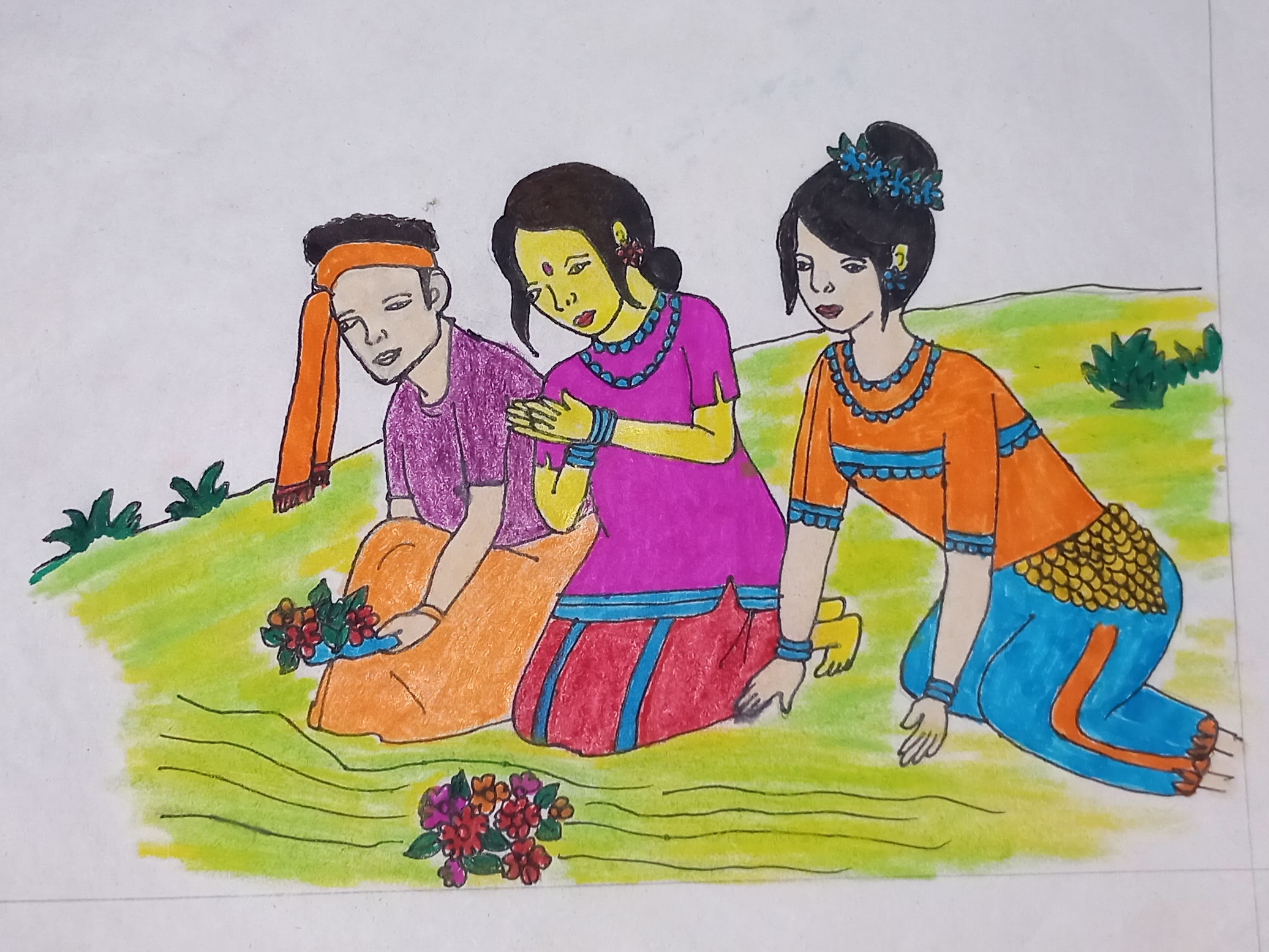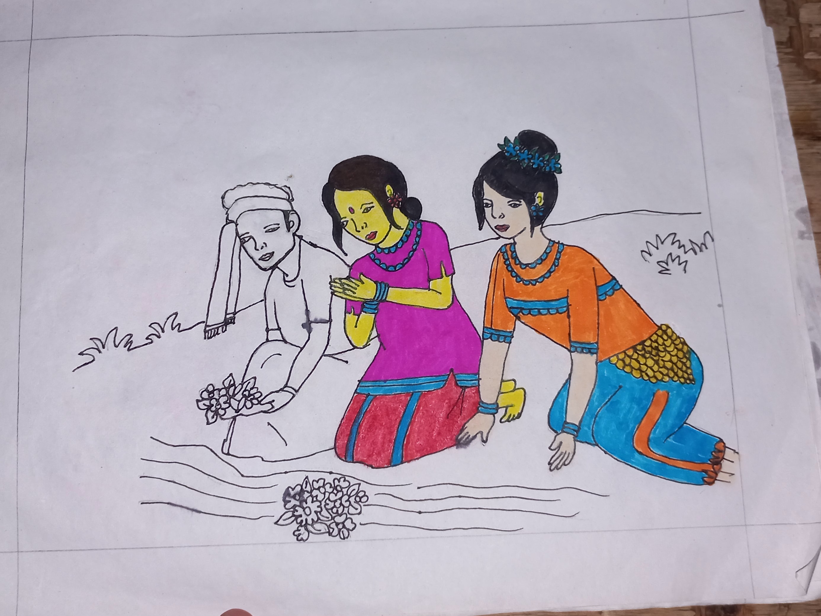 Now draw a bouquet of flowers in front of the people. Draw the surface of a hill at the upper side. Next draw the borders of this full picture with a black color pen.