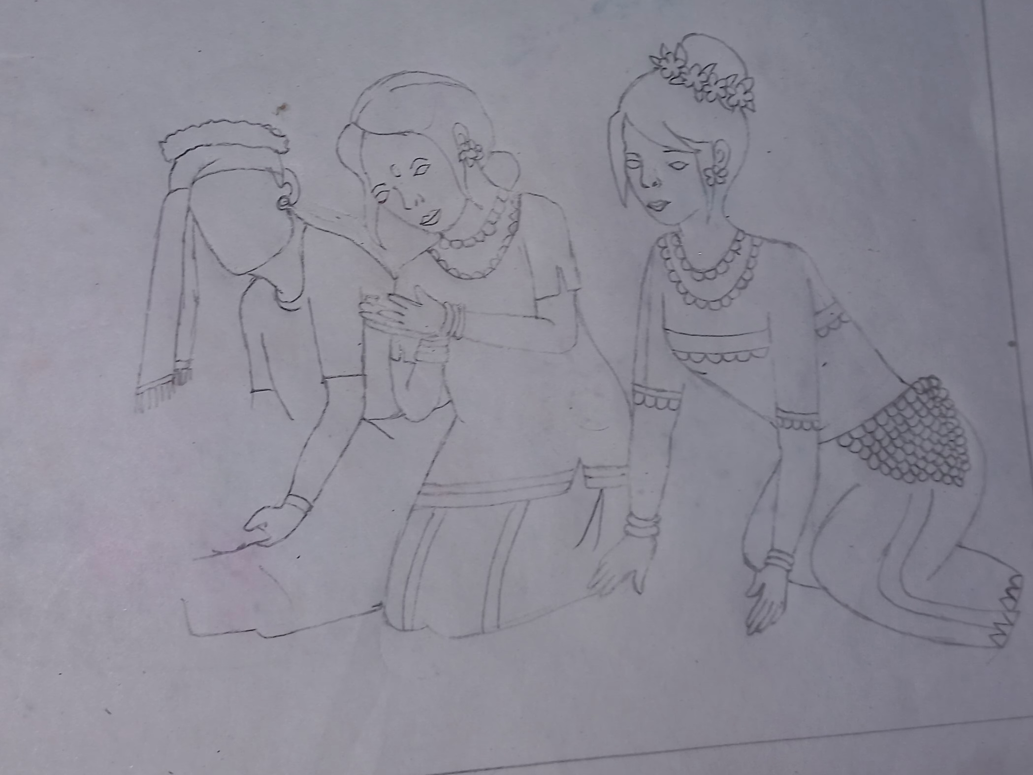 Draw another girl at her left side. Draw her curve shoulder, dress's sleeves and lower part of dress. Then draw her face, head and two hands in hand in hand position. Then draw a boy at the left side. Draw his head wearing a round cloth. Draw his face, dress and two hands holding flowers.