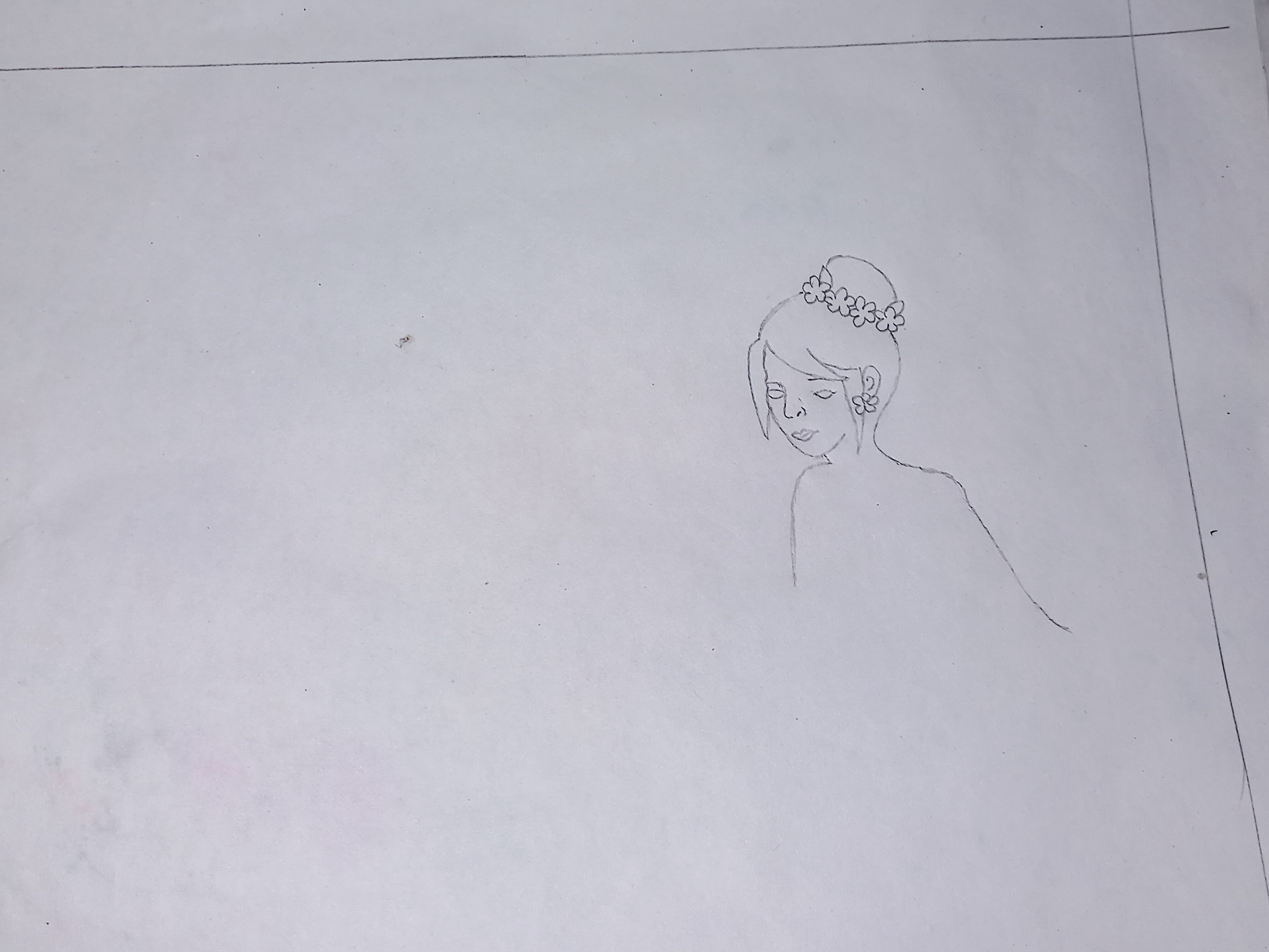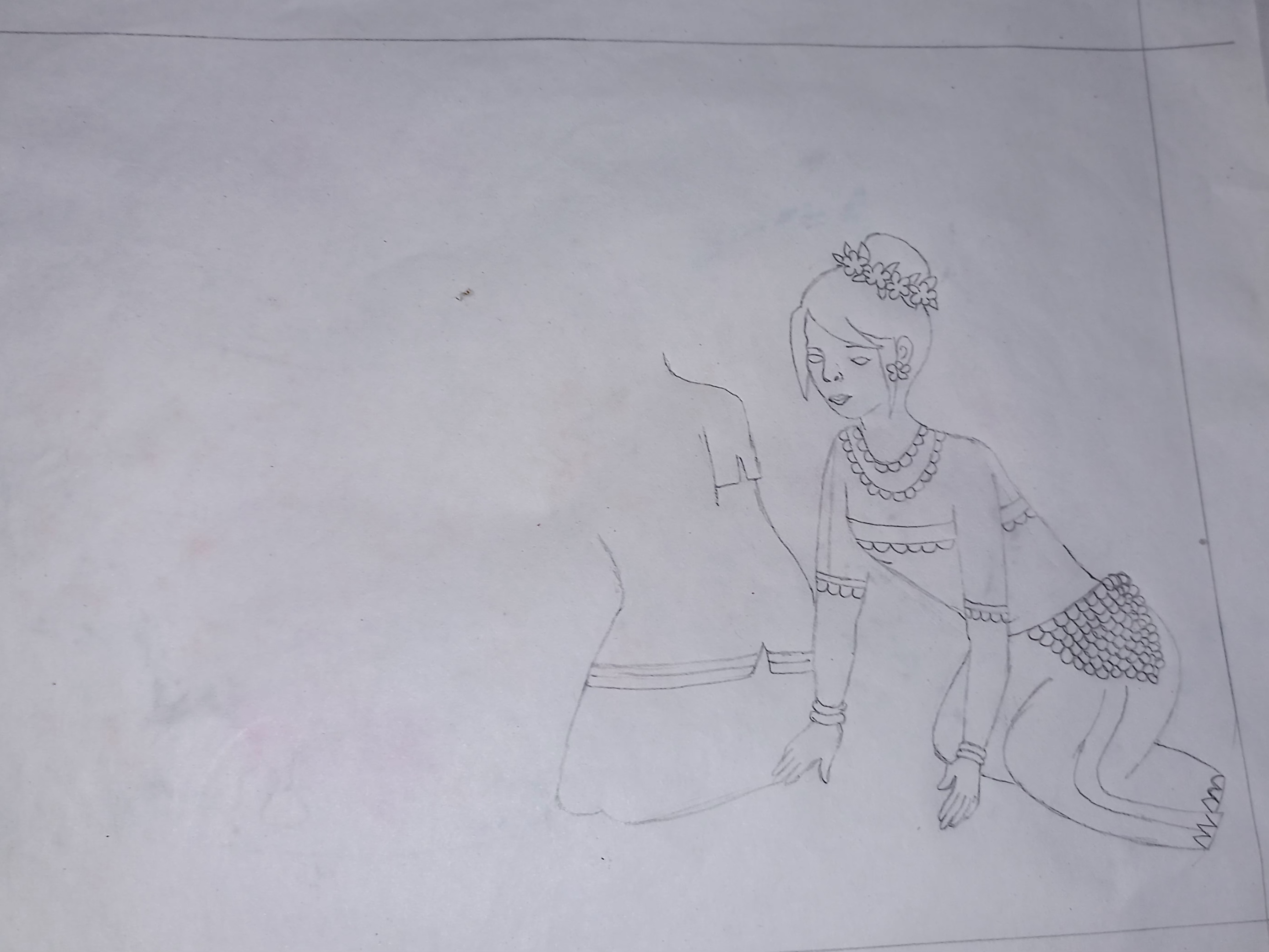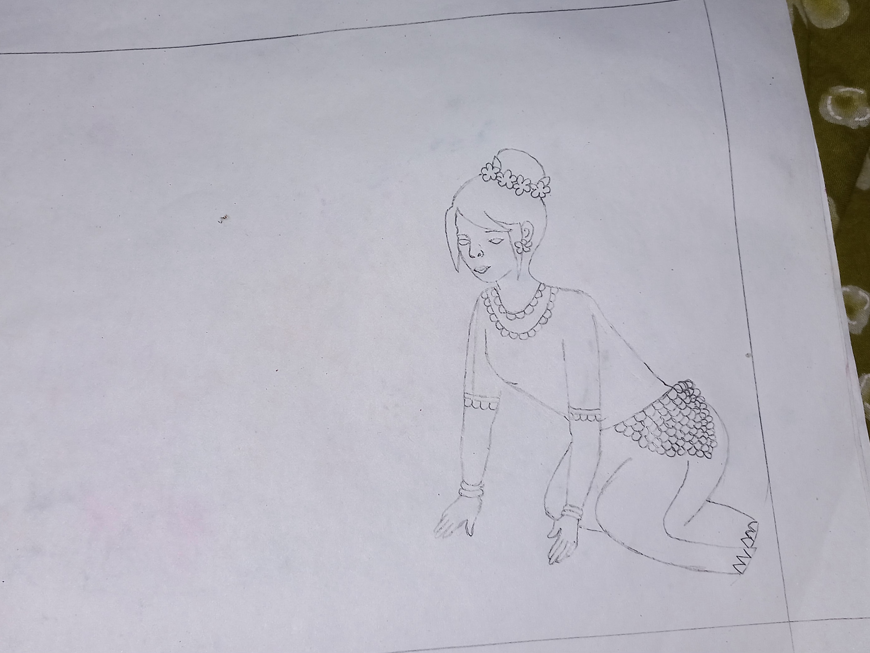 At first draw the head and face of a girl. Draw her round hair bun with a flower string. Draw her neck,dress and two hands. Draw her waist and legs in a curve position.