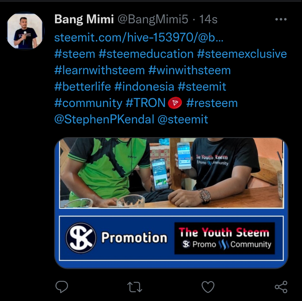 As long as I rejoin Steemit, I actively contribute to promoting the Steemit platform to the Indonesian people and Youth. I really enjoy the activity, I often use the #Promo-Steem attribute and share other Steemit properties. So, already familiar in the city where I live, I am known as an active Steemit user.