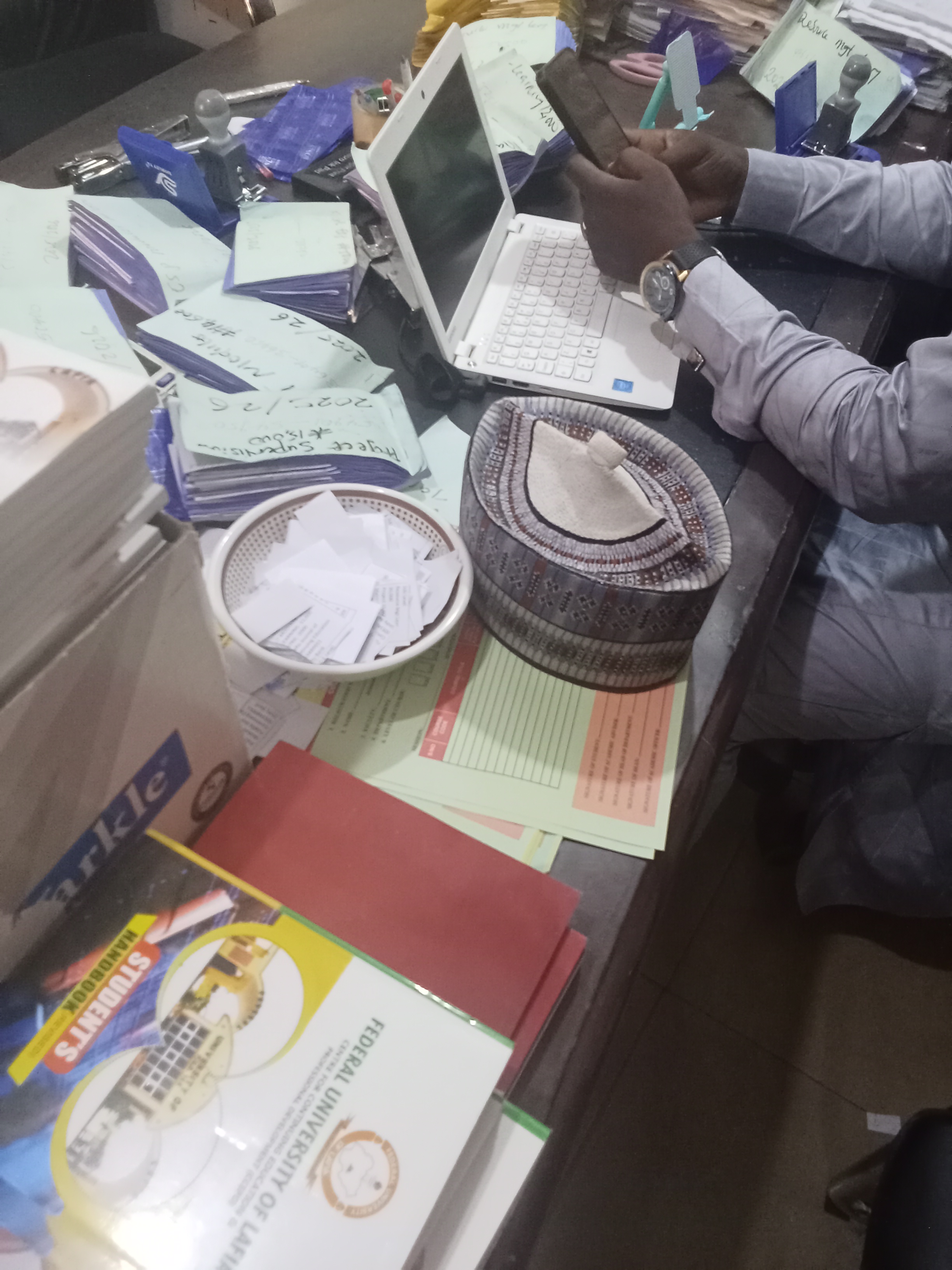 From the pictures, you can see stacks of files, identity slips, handwritten records, and registration forms, which are all spread across the desk each of the stacks of files represents the academic journey of students and staff who were busy going through his phone.
