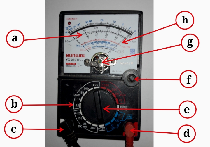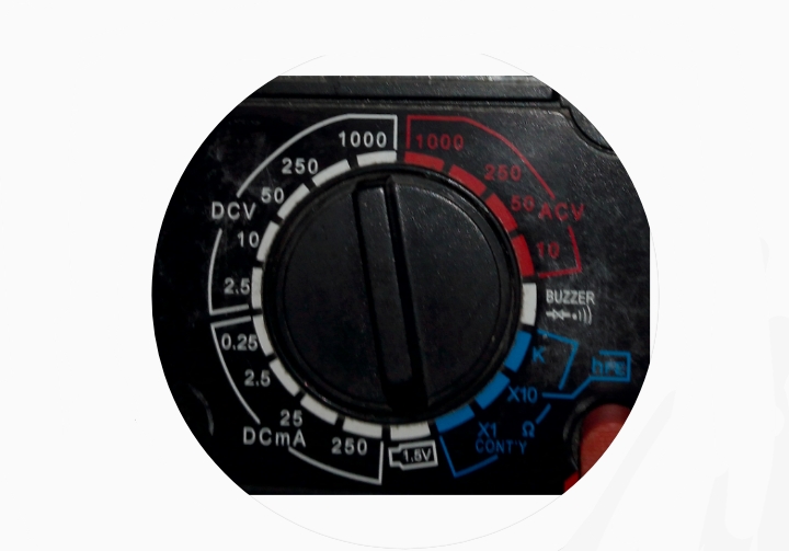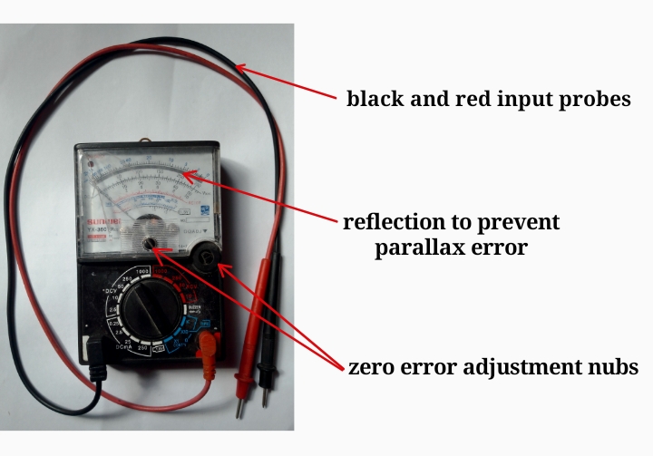 The multimeter is a moving coil measuring instrument powered by two 1.5 Volte double A battery. It has a dial for selecting various functions, two probs for basic input one being red and the other black. The result is displayed on a multi graduated scale with a pointing needle that deflects to provide a reading.