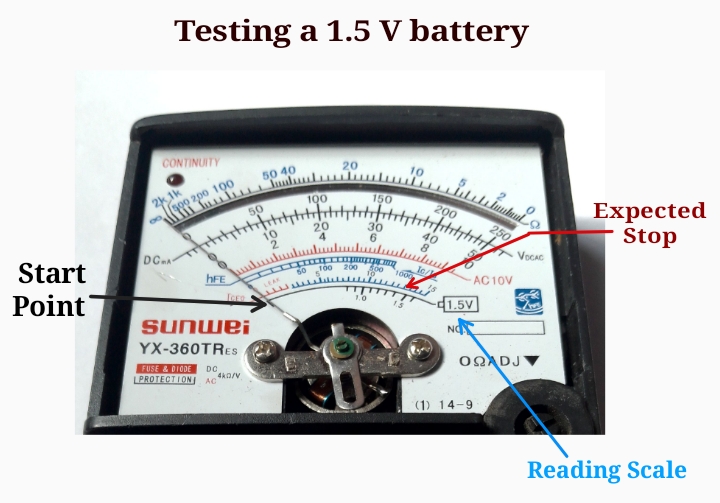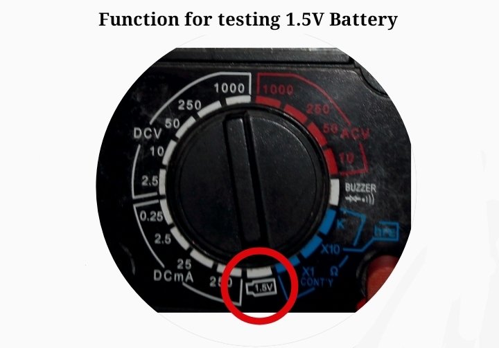 This multimeter has a function specifically for testing 1.5Volt batteries. This will give a more accurate output as the whole range is scaled for 1.5