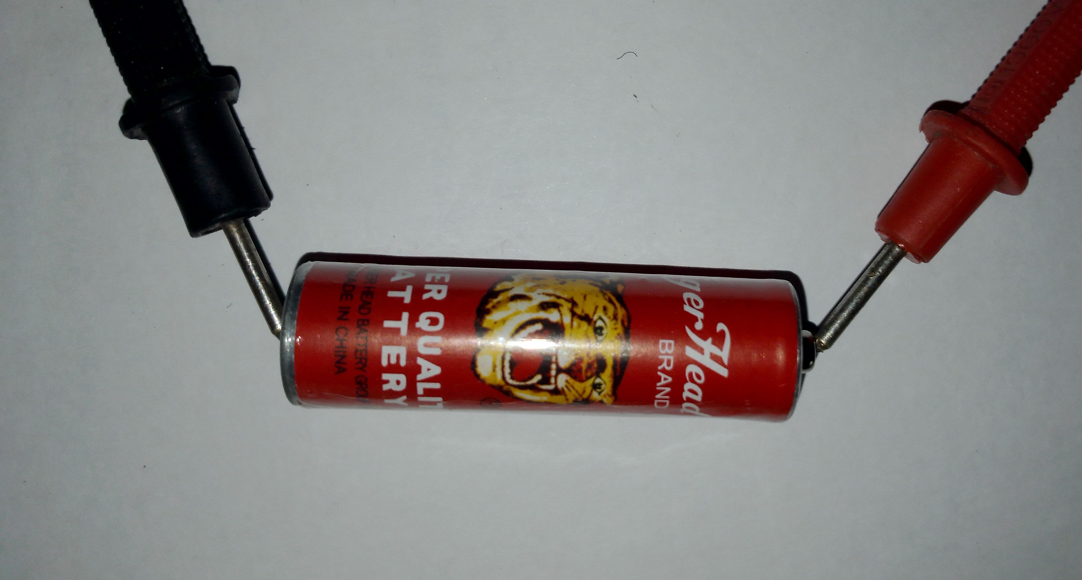 The probs should be connected to both sides of the double A battery, the positive probe which is red should be connected to positive end of the battery as shown in the picture below