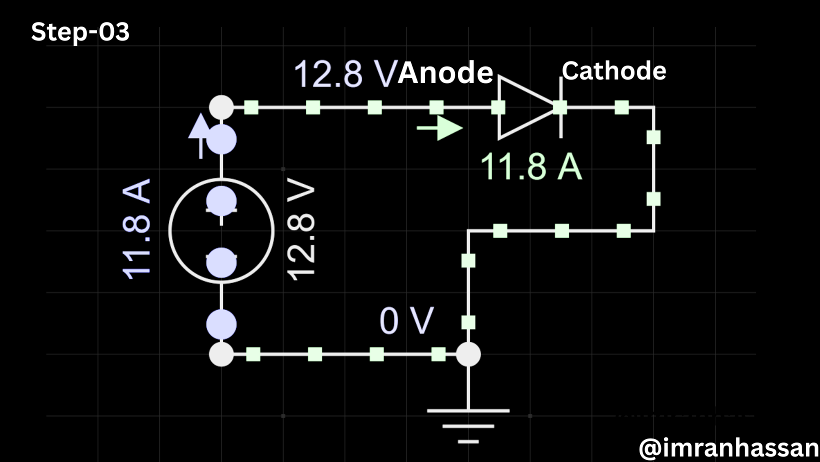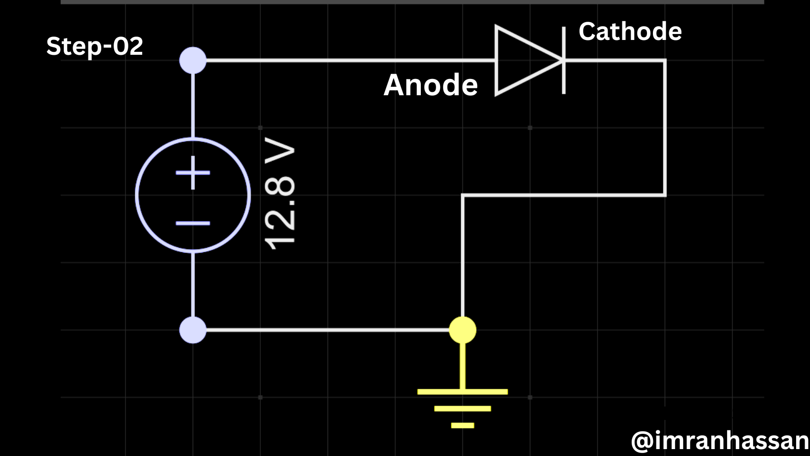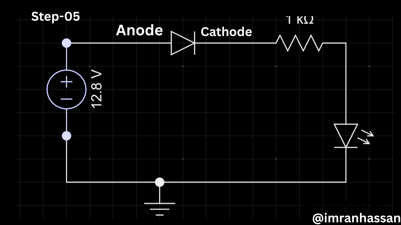 Here you can see that I have determined the symbol and anode–cathode direction of the diode through the simulation software so that the correct direction of the current can be understood. And when I complete the circuit, so that its explanation can be understood very well.