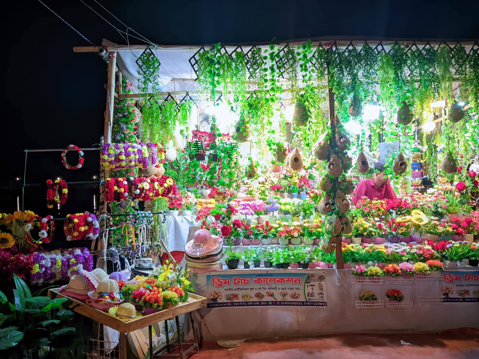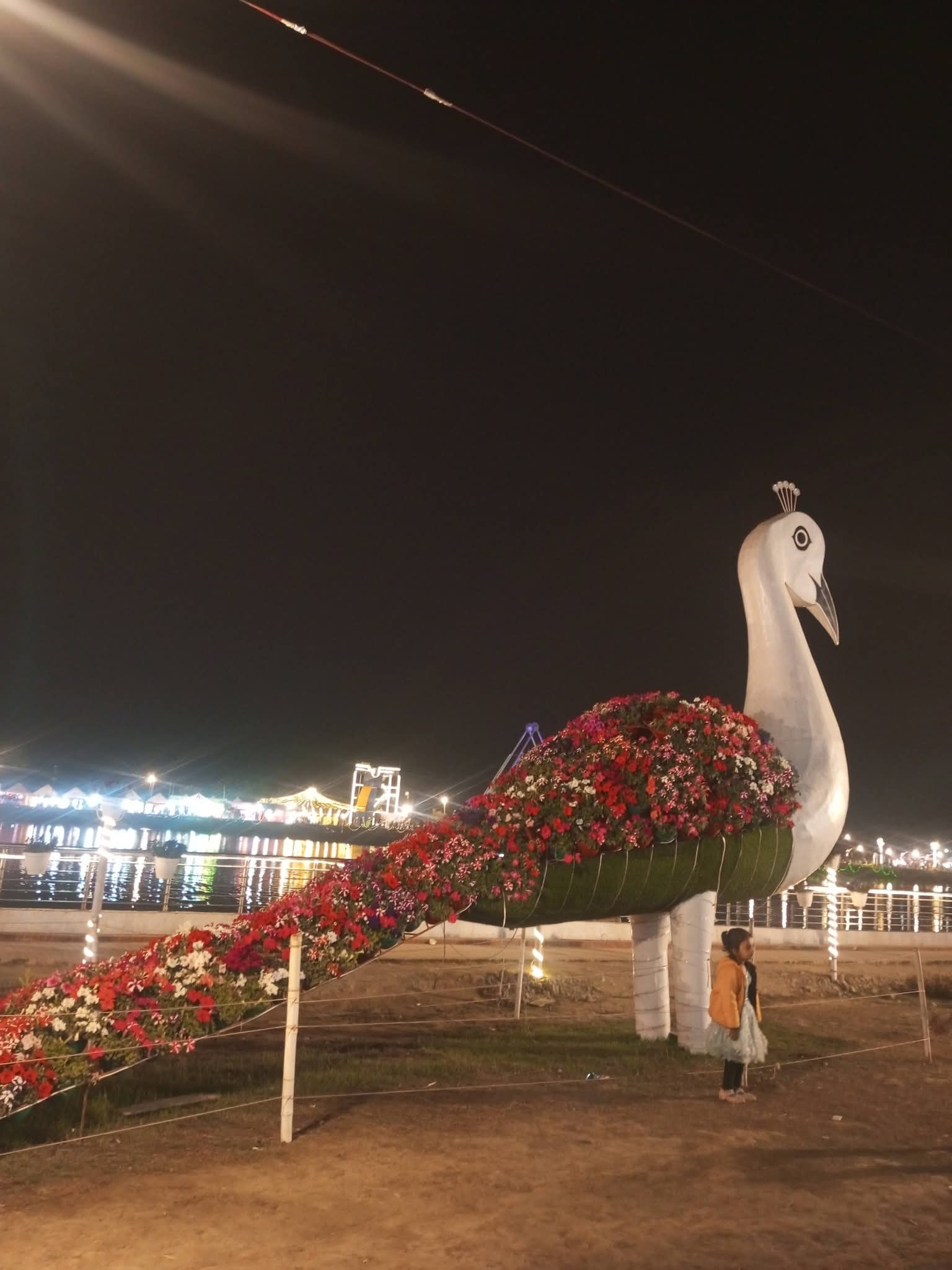 Night: The Magic of Park Illumination,After Iftar, I returned to the park to see it lit up at night. The artificial lights transformed the place into a magical wonderland. I was especially mesmerized by a giant peacock sculpture made entirely of vibrant flowers. I also explored the small stalls and the nursery area where plants were beautifully arranged in small pots.